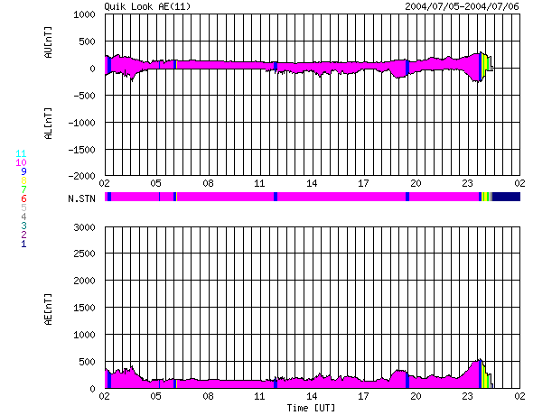 ACEが観測した太陽風の磁場(1番上の枠、白線は全体の強度、赤線は南北成分) および、太陽風の密度(3番目の橙線)、速度(4番目の黄線) (c) NOAA/SEC ![]() リアルタイムAE指数 下段のAEグラフの値が高くなると、オーロラ活動が活発化しています。 (c) 京都大学, NICT ![]() GOES衛星による、静止衛星軌道における高エネルギー電子の変化 (c) NOAA/SEC ![]() SOHO衛星のMDIカメラによる太陽黒点 (c) SOHO (ESA & NASA) ![]() GOES衛星の太陽X線データ (c) NOAA/SEC ![]() | ||||||||||||||||||||||||||||||||||||||||
