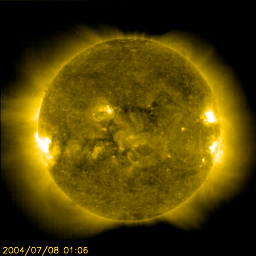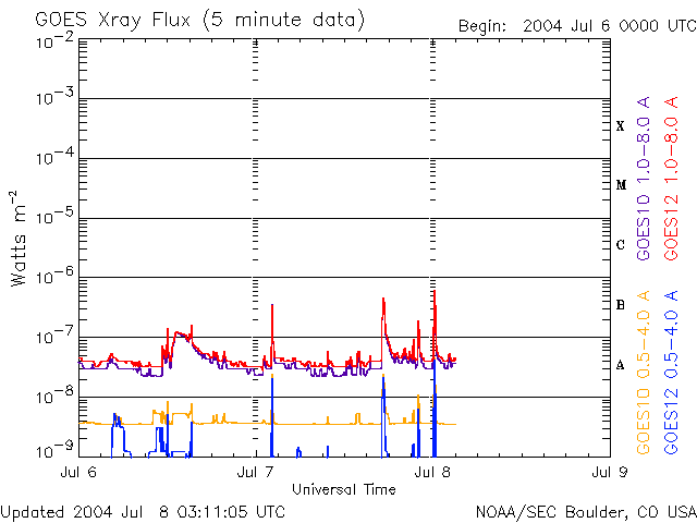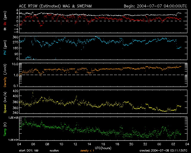 2004/ 7/ 8 12:13 更新 磁気圏は穏やかです。 担当 篠原 太陽風の速度は360km/秒に下がり、かなり低速となっています。 磁場強度も3nTに弱まり、地球の磁気圏を乱す要因はほとんど無くなっています。 オーロラ活動を示すAE指数のグラフには、ほとんど変化が見られず、 磁気圏内がかなり安定している事を示しています。 これから太陽風磁場の方向の切り替わりが見られるでしょう。 今後2〜3日程度は安定した状態が続き、その後やや乱れる事が予想されます。 SOHO衛星のEIT 284カメラの太陽画像は、全面的に一様にぼんやりと輝いて見え、 高速風が吹き出しているコロナホール(暗い穴として見えます)は無く、 明るく輝く活動的な領域も小さく両端に見える程度です。 太陽黒点では、新しく641群の番号が付けられています。 フレア(太陽爆発)の活動は穏やかで、Cクラスにも満たない、 たいへん小さい活動が見られている程度です。 SOHO衛星のEIT284カメラの映像 (c) SOHO (ESA & NASA)