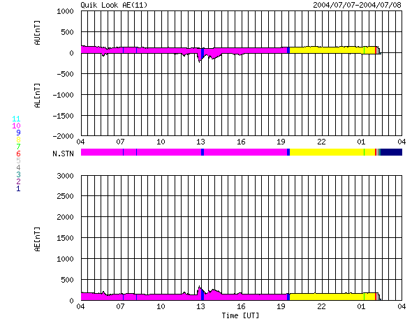 ACEが観測した太陽風の磁場(1番上の枠、白線は全体の強度、赤線は南北成分) および、太陽風の密度(3番目の橙線)、速度(4番目の黄線) (c) NOAA/SEC ![]() リアルタイムAE指数 下段のAEグラフの値が高くなると、オーロラ活動が活発化しています。 (c) 京都大学, NICT ![]() SOHO衛星のMDIカメラによる太陽黒点 (c) SOHO (ESA & NASA) ![]() GOES衛星の太陽X線データ (c) NOAA/SEC ![]() | ||||||||||||||||||||||||||||||||||||||||