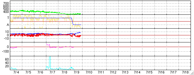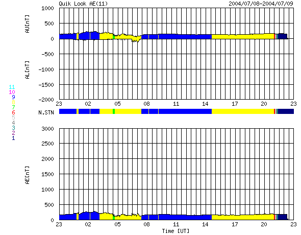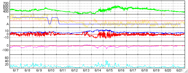 ACEが観測した太陽風の磁場(1番上の枠、白線は全体の強度、赤線は南北成分) および、太陽風の密度(3番目の橙線)、速度(4番目の黄線) (c) NOAA/SEC ![]() リアルタイムAE指数 下段のAEグラフの値が高くなると、オーロラ活動が活発化しています。 (c) 京都大学, NICT ![]() 27日の太陽周期に合わせたデータプロット (太陽風版) 太陽が同じ面を地球に向けていた27日前の変化から、今後を予想することができます。 (c) NICT