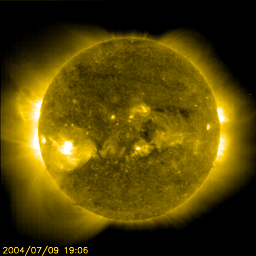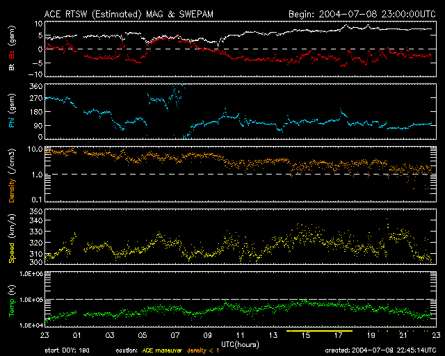 2004/ 7/10 07:48 更新 太陽風磁場のセクター境界を越えました。太陽風は300km/秒、磁気圏は静穏です。 担当 篠原 9日12時(世界時9日3時)頃に太陽風磁場のセクター境界を越えました。 太陽風の磁場の向きが、これまではおおまかに太陽向きだったのが、 現在は太陽から地球向きに変わっています。 この変化そのものによる影響はほとんどありませんが、 これに続く様に太陽風に乱れが発生する事があります。 現在の太陽風の速度は300km/秒をやや上回る程度で、大変低速です。 一方、磁場に変化が見られています。 強度が急に上昇し、7nT程度まで強まっています。 また、南向き成分が強まっていて、-5nTの強めの南向きが長時間続いていました。 これらの変化は、27日前の太陽風の変化にも見られています。 南向きが強まっていますが、太陽風の速度がたいへん遅いため、磁気圏は穏やかです。 AE指数には変化が見られません。 太陽風磁場が急に強まると、それに続いて太陽風の速度が上昇する事が良くあります。 (前周期の太陽風速度と、太陽風磁場強度の変化をご覧下さい) 今回の上昇が更に続いた場合、それに続いて太陽風の速度が上昇する事も考えられます。 ただし、SOHO EIT284カメラの太陽画像には、コロナホールはほとんど見られず、 速度の大きな上昇は無さそうにも思われます。 今後の変化に注目です。 太陽黒点は小さな642群が見えている程度です。 X線のバックグラウンドの強度がやや上がっています。 東から新しい活動領域が上って来つつある様です。 SOHO衛星のEIT284カメラの映像 (c) SOHO (ESA & NASA)