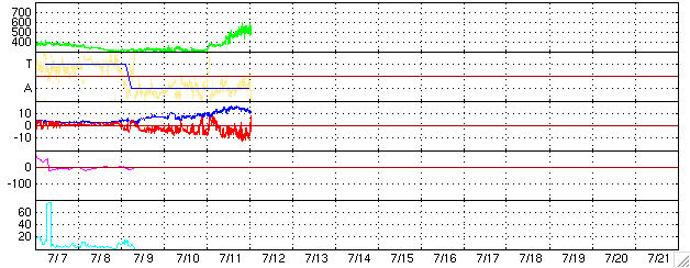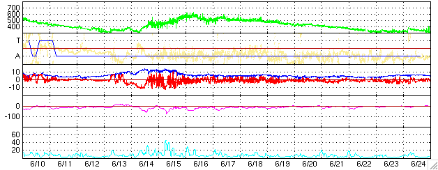 ACEが観測した太陽風の磁場(1番上の枠、白線は全体の強度、赤線は南北成分) および、太陽風の密度(3番目の橙線)、速度(4番目の黄線) (c) NOAA/SEC ![]() リアルタイムAE指数 下段のAEグラフの値が高くなると、オーロラ活動が活発化しています。 (c) 京都大学, NICT ![]() 27日の太陽周期に合わせたデータプロット (太陽風版) 太陽が同じ面を地球に向けていた27日前の変化から、今後を予想することができます。 (c) NICT