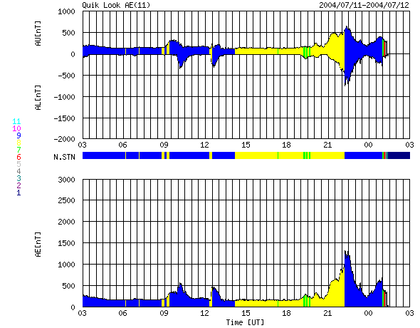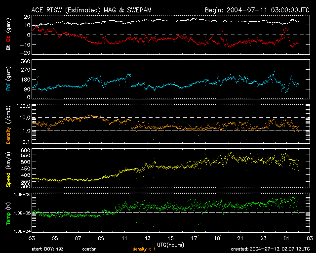 2004/ 7/12 11:06 更新 太陽風の速度が500km/秒へ上昇しています。南向き磁場が強いため、磁気圏が乱れ始めています。 担当 篠原 ACE衛星の観測によると、11日19時(世界時11日10時)頃から太陽風の速度が上昇を始め、 現在500km/秒に上がっています。 太陽風磁場強度も10nTと強く、しかも南向き成分が強く現れています。 このため、磁気圏は急に活動的になっています。 オーロラ活動を示すAE指数は100nTを越え、 磁気圏に強いエネルギーの流入が起こっている事を示しています。 一昨日からの太陽風磁場強度の強まりは、高速太陽風と関連した変化だった様です。 27日周期の図をご覧下さい。 今回の変化は(下段の図)、前周期の変化(上段の図)とよく似ています。 この様子から予想すると、高速太陽風は4日程度続きそうです(緑色線)。 太陽風磁場は、もう一日程度大きく乱れそうです(3列目の赤・青線)。 その後は小刻みな乱れに収まります。 磁気圏の乱れは1〜2日程度活発に続く可能性があります。 太陽黒点は、新しく644群がはっきりと黒い姿を見せ始めました。 一方、SOHO EIT284の太陽画像左側がとても明るく見えていますが、 活発な活動領域が上がって来た様です。 この領域が原因で、GOES衛星X線のグラフを見ると、 11日15時(世界時11日6時)頃からレベルが一段上昇し、Cクラスの活動が継続的に観測されています。 今後、Mクラスの中規模フレアが観測される可能性もあります。 SOHO衛星のEIT284カメラの映像 (c) SOHO (ESA & NASA)
