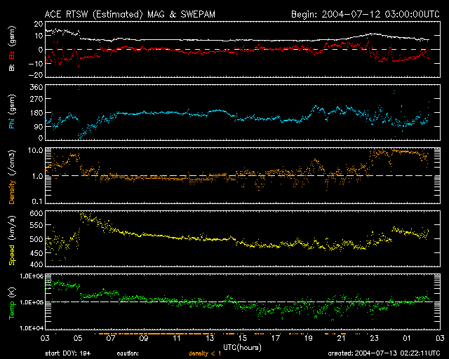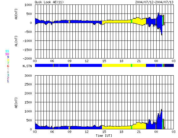 SOHO衛星のMDIカメラによる太陽黒点 (c) SOHO (ESA & NASA) ![]() GOES衛星の太陽X線データ (c) NOAA/SEC ![]() ACEが観測した太陽風の磁場(1番上の枠、白線は全体の強度、赤線は南北成分) および、太陽風の密度(3番目の橙線)、速度(4番目の黄線) (c) NOAA/SEC ![]() リアルタイムAE指数 下段のAEグラフの値が高くなると、オーロラ活動が活発化しています。 (c) 京都大学, NICT ![]() | ||||||||||||||||||||||||||||||||||||||||||||