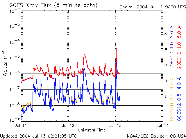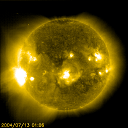 2004/ 7/13 11:25 更新 太陽のフレア活動が活発になっています。太陽風はやや高速(500km/秒)です。 担当 篠原 太陽のフレア(太陽爆発)活動が活発になっています。 12日17時(世界時12日8時)頃にM1.6の中規模フレアが、 太陽の東端(左端)から上がってきた活動領域(SOHO EIT284の写真参照)で発生しました。 このフレアに伴って、CME(太陽ガスの放出現象)が観測されています。 SOHO LASCO C3の画像をご覧下さい。 東側に向かって放出されていますので、地球への影響はほとんどないでしょう。 この活動領域はCクラスの小規模フレアも頻繁に発生させています。 これから更に地球側に向いて来ますので、今後のCMEの発生には注意が必要でしょう。 そして、13日9時(世界時13日0時)にM6.7のやや大きめの中規模フレアが、 太陽の西寄り(右寄り)に見える646黒点群で発生しました。 この黒点群は昨日の黒点写真ではまだ番号もふられておらず、急に活動的になって来たものです。 これらの活動領域によって、今後もMクラスの中規模フレアが発生する可能性があるそうです。 太陽風の速度は増減しながらも500km/秒とやや高速な状態を保っています。 磁場強度はやや下がって、7nT程度になっています。 南北成分はほぼ0nTの状態が長く続き、磁気圏の活動は穏やかになっていました(AE指数参照)。 ACEの太陽風データによると、13日8時(世界時12日23時)から、 南向きの磁場が急に強まっています。 このため、磁気圏のオーロラ活動も活発化しそうです。既に、AEのグラフに急増が見られています。 太陽風速度がやや高い状態はもう数日続くでしょう。 一方、太陽風磁場の擾乱は弱まりつつあり、磁気圏が大きく乱れることはないでしょう。 SOHO衛星のEIT284カメラの映像 (c) SOHO (ESA & NASA)