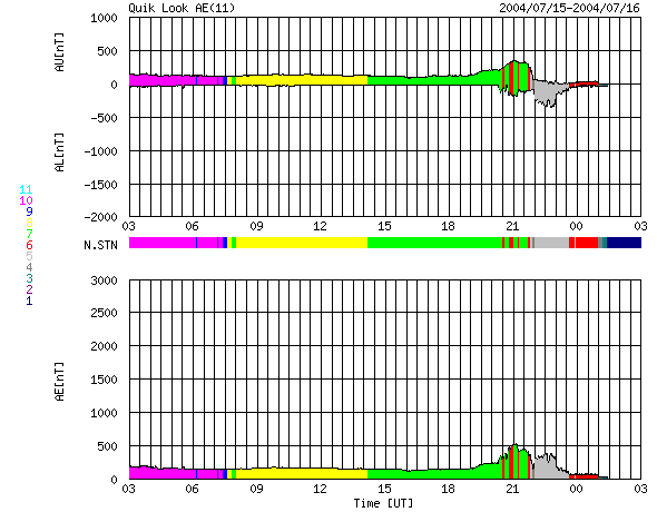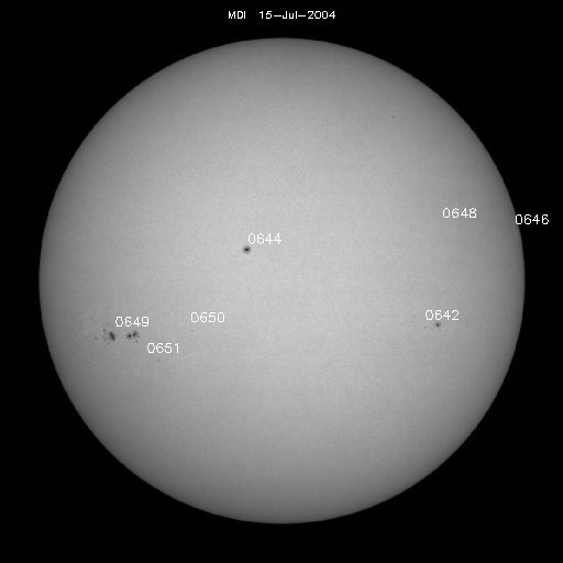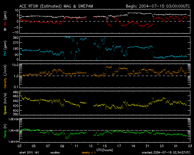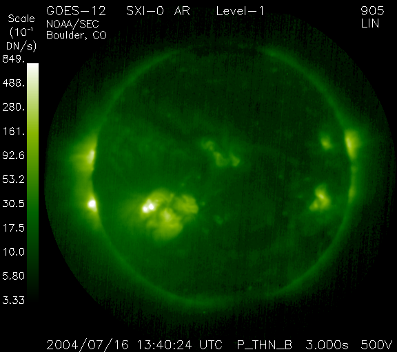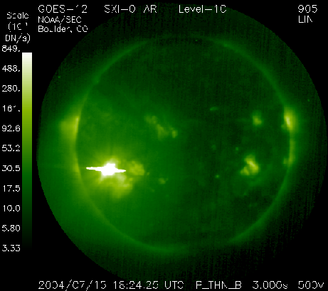 ACEが観測した太陽風の磁場(1番上の枠、白線は全体の強度、赤線は南北成分) および、太陽風の密度(3番目の橙線)、速度(4番目の黄線) (c) NOAA/SEC ![]() リアルタイムAE指数 下段のAEグラフの値が高くなると、オーロラ活動が活発化しています。 (c) 京都大学, NICT ![]() GOES衛星の太陽X線データ (c) NOAA/SEC ![]() SOHO衛星のMDIカメラによる太陽黒点 (c) SOHO (ESA & NASA) ![]() 2004/ 7/16 23:35 追加 GOES衛星のX線カメラが捉えたX3.7の大規模太陽フレア。16日23時(世界時16日14時) (c) NOAA/SEC ![]() GOES衛星の太陽X線データ (c) NOAA/SEC ![]() | ||||||||||||||||||||||||||||||||||||||||