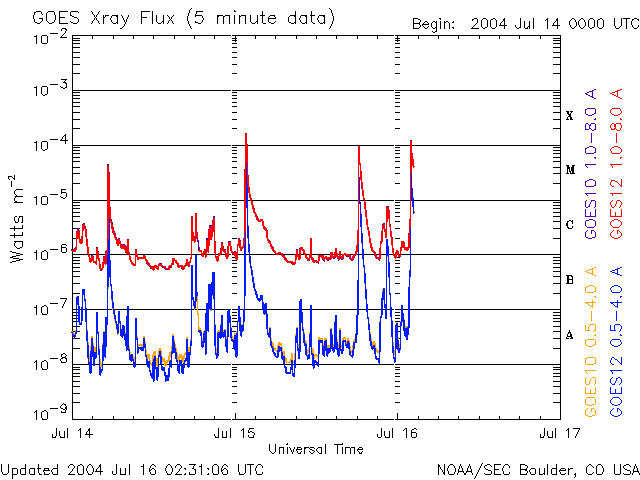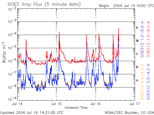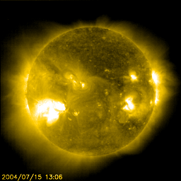 2004/ 7/16 11:36 更新 649黒点群は活発で、今日になってXクラスの大規模フレアを2回起こしています。太陽風、磁気圏は静穏です。 2004/ 7/16 23:35 追加 X3.7の大規模フレアが発生しました。 担当 篠原 昨日お知らせしていましたが、太陽風の衝撃波は今の所観測されていません。 太陽風は速度440km/秒程度で穏やかです。 今日の夜までは注意が必要ですが、時間が遅くなるほど衝撃波の速度も遅くなりますので、 磁気圏を乱す可能性は小さいと考えられます。 その後は、太陽風は穏やかな状態が続くでしょう。 太陽黒点の649群は現在も活発です。 今朝、16日3時(世界時15日18時)にX1.6の大規模フレアを発生させています。 649群は現在も規模は大きく、引き続き注意が必要でしょう。 このフレアによるCME(太陽ガスの放出現象)の発生については、まだ不明です。 最新情報ですが、ちょうど今、16日11時(世界時16日2時)にX1程度の大規模フレアが発生しました。 発生箇所は649黒点群です。 2004/ 7/16 23:35 追加 (篠原) 関連の図はページの最後にあります 16日23時(世界時16日14時)にX3.7に達する大規模なフレア(太陽爆発)が発生しました。 発生源は649黒点群です。 CME(太陽ガスの放出現象)などについては今後の情報に注意して下さい。 この黒点群は今日だけでXクラスの大規模フレアを4回も発生させています。 今後も引き続き注意が必要でしょう。 ページの最後にこのフレアのX線画像の動画を掲載しています。ご覧下さい。 GOES衛星の太陽X線画像による太陽フレア。16日3時(世界時15日18時) (c) NOAA/SEC ![]() SOHO衛星のEIT284カメラの映像 (c) SOHO (ESA & NASA)