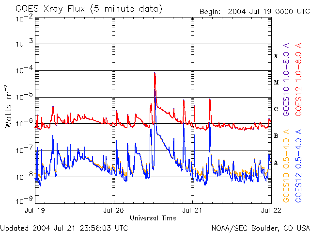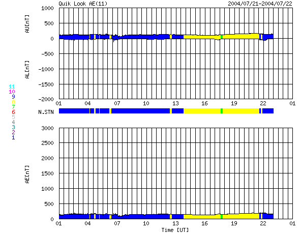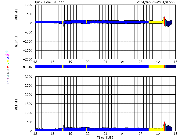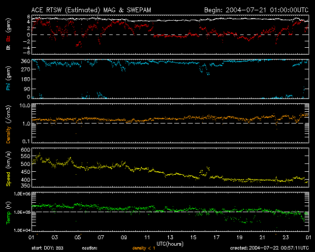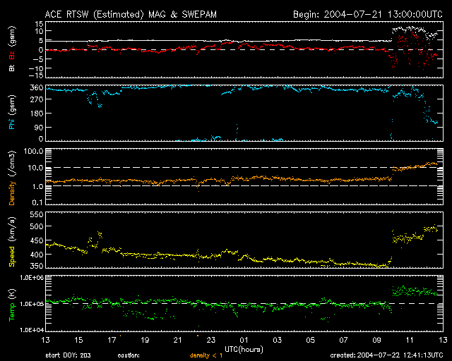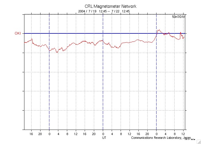 SOHO衛星のMDIカメラによる太陽黒点 (c) SOHO (ESA & NASA) ![]() GOES衛星の太陽X線データ (c) NOAA/SEC ![]() ACEが観測した太陽風の磁場(1番上の枠、白線は全体の強度、赤線は南北成分) および、太陽風の密度(3番目の橙線)、速度(4番目の黄線) (c) NOAA/SEC ![]() リアルタイムAE指数 下段のAEグラフの値が高くなると、オーロラ活動が活発化しています。 (c) 京都大学, NICT ![]() 2004/ 7/22 21:41 追加 ACEが観測した太陽風の磁場(1番上の枠、白線は全体の強度、赤線は南北成分) および、太陽風の密度(3番目の橙線)、速度(4番目の黄線) (c) NOAA/SEC ![]() リアルタイムAE指数 下段のAEグラフの値が高くなると、オーロラ活動が活発化しています。 (c) 京都大学, NICT ![]() 沖縄の磁場擾乱 下へ下がるほど、擾乱が発達している事を意味します。 (c) NICT ![]() | ||||||||||||||||||||||||||||||||||||||||
