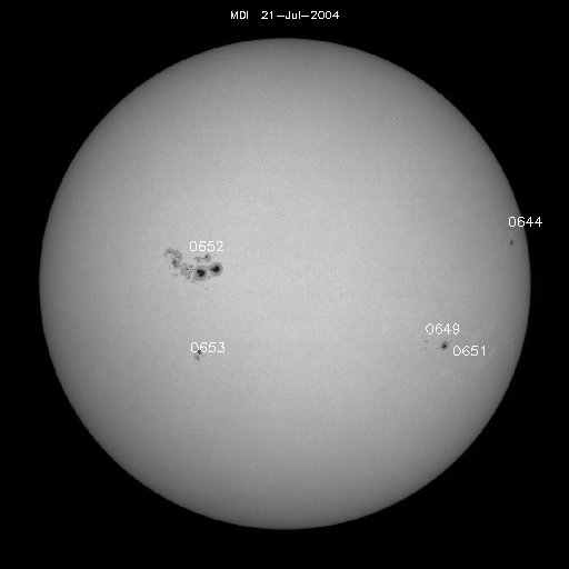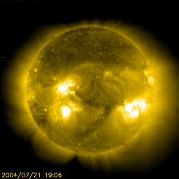 2004/ 7/22 09:58 更新 フレア活動はやや落ち着いていますが、依然注意が必要です。磁気圏は静穏です。 2004/ 7/22 21:41 追加 22日19時半に衝撃波が到来しました。太陽風の速度、磁場強度が上昇しています。 担当 篠原 太陽面では、最初に活発な活動を見せていた649黒点群はすっかり小さくなってしまいました。 一方、652黒点群は現在も規模をやや広げている様です。 かなり大きな姿を見せています。 昨日一日、フレア(太陽爆発)の活動はやや落ち着いていました。 しかしつい先ほど、22日9時半(世界時22日0時半)頃に、 M9クラスのかなり大きな中規模フレアが発生した様です。 X線データの最後の部分に急上昇が見えています。 今後も引き続き大規模フレアに対する注意が必要でしょう。 また、黒点が太陽の中心に近づいていますので、 CME(太陽ガスの放出現象)を発生させた場合には地球への影響が大きくなります。 太陽風の速度は引き続き低下を続け、400km/秒と静穏レベルへ戻っています。 磁場強度は5nT程度ありますが、特に南を向くという事も無く、 地球の磁気圏はとても静穏です。 オーロラ活動を示すAE指数のグラフには何の変化も観測されていません。 20日にSOHOで観測されたCME(太陽ガスの放出現象)について、 今夜遅くから、明日にかけて高速太陽風の衝撃波が地球へ来るかもしれないと 昨日の記事で書きましたが、 他研究所の報告などを見ると、あまり高速な放出現象ではなく、 目立った変化を起こさない可能性もあるとの事です。 いずれにせよ、明日いっぱい注意をすれば十分でしょう。 速度が遅い場合でも、太陽風磁場が大きく南を向く事で、 磁気嵐が発達するなどの可能性はあります。 2004/ 7/22 21:41 追加 (篠原) 関連の図はページの最後にあります 22日19時半(世界時22日10時半)頃に太陽風の衝撃波が地球に来ました。 太陽風の速度が、350km/秒から450km/秒、更に500km/秒へ上昇しています。 プラズマの密度も10個/cc程度に増加、磁場強度も10nT前後へ増加しています。 このため、沖縄の磁場データでは10nT強の急激な磁場の増加が観測されています。 太陽風磁場の南北成分は激しく南北に変化しています。 一定した南向き成分を持っていないため、現時点では磁気圏が大きく乱れる可能性は低そうですが、 引き続き南向き成分の変化に注意が必要です。 この衝撃波は、今日のニュースでお知らせしていた衝撃波とは異なるものと思われます。 それは、到達時間がやや早すぎるという事と、 到達時間が早くなった割には速度の上昇が小幅であるためです。 今後、改めて別の衝撃波が到来する可能性が高いと思います。 SOHO衛星のEIT284カメラの映像 (c) SOHO (ESA & NASA)
