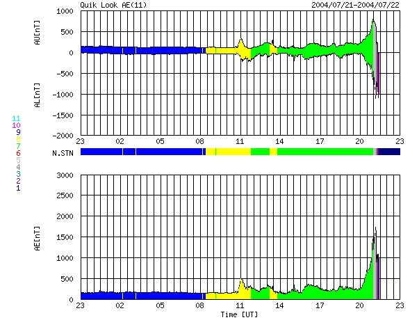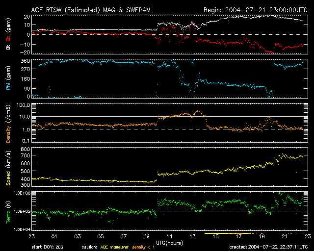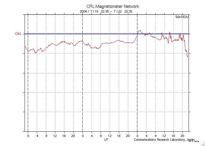 2004/ 7/23 07:38 更新 太陽風の磁場が大きく南を向いています。磁気圏が大きく乱れ、磁気嵐になりそうです。 担当 篠原 昨夜、22日19時半(世界時22日10時半)頃に太陽風の衝撃波が地球に来ました。 太陽風の速度が、350km/秒から450km/秒へ急に上昇し、 引き続いて緩やかな上昇を続け、現在は700km/秒ととても高速になっています。 太陽風の磁場強度も一旦10nTへ急増し、 その後速度上昇と同様に、緩やかに20nTへ増加しています。 磁気圏擾乱に重要な太陽風磁場南向きの成分(赤線のマイナス方向)は、 初め南北に激しく振れるだけでしたが、 その後安定的に、-10nTから最大-20nTに達する大きな南向きを続けています。 22日22時(世界時22日13時)から南向きは始まり、既に10時間近く続いています。 AE指数を見ると、23日5時(世界時22日20時)頃から擾乱が急激に発達しています。 AE指数は1500nTに達する変化を示しています。 大きなエネルギーが地球の磁気圏に注入されている様です。 これに対応する様に、沖縄の磁場データは静穏レベルから-50nTを越える磁場の減少を示しています。 この減少は今後さらに強まり、磁気嵐に発達するものと予想されます。 太陽風磁場の強い南向きはまだしばらく続きそうです。 その間は、太陽風の速度が高速であることもあって、磁気圏の擾乱を発達させるでしょう。 やがて、南向きから北向きに変化します。擾乱の発達はそこで止まります。 太陽面では652黒点群が大きな規模を保っています。 面積、黒点数ともに増加してもいるようです。 フレア活動はやや収まっていますが、引き続き注意が必要です。 ACEが観測した太陽風の磁場(1番上の枠、白線は全体の強度、赤線は南北成分) および、太陽風の密度(3番目の橙線)、速度(4番目の黄線) (c) NOAA/SEC ![]() リアルタイムAE指数 下段のAEグラフの値が高くなると、オーロラ活動が活発化しています。 (c) 京都大学, NICT ![]() 沖縄の磁場擾乱 下へ下がるほど、擾乱が発達している事を意味します。 (c) NICT ![]() SOHO衛星のMDIカメラによる太陽黒点 (c) SOHO (ESA & NASA) ![]() GOES衛星の太陽X線データ (c) NOAA/SEC ![]() | |||||||||||||||||||||||||||||||||||||||