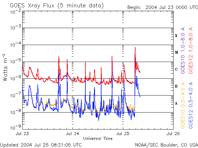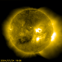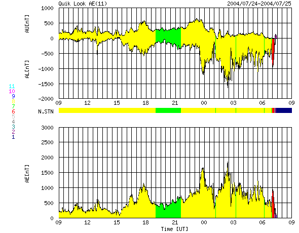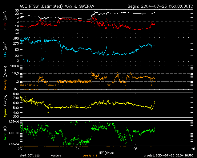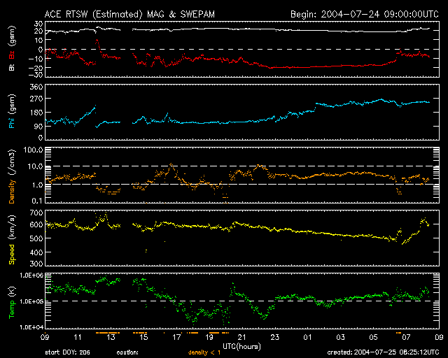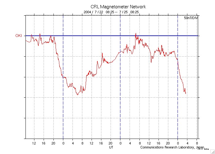 2004/ 7/25 17:26 更新 24日15時に2つめの衝撃波が来ました。太陽風が大きく乱れ、磁気嵐が大きく発達しています。 担当 篠原 大きな擾乱が発生していますが、ニュースの更新が遅れてしまい申し訳ありません。 22日に来た太陽風の大きな乱れに続いて、 24日15時(世界時24日6時)に2つめの衝撃波が地球に届きました。 ACE衛星の1日の図ではデータ幅が不足しますので、3日分の図を掲載しています。 いつもの図とは時間幅が異なりますので注意して下さい。 (通常の1日の図も掲載しています) 太陽風の速度が500km/秒から600km/秒に増加し、太陽風の磁場も15〜20nTに急増しました。 地球磁気圏の擾乱に決定的だったのは、太陽風磁場南向き成分の変化です。 ACE衛星のデータの赤線を見ると、初め北を向いていましたが(プラス方向に)、 次第に南向きが強まり始め(マイナス方向)、-15nTから最大で-20nTに達しています。 太陽風が高速であることと、磁場が大きく南を向いたため、 磁気圏に膨大なエネルギーが流れ込み、現在、磁気嵐が大きく発達しています。 沖縄の磁場変化を見ると、24日から擾乱が緩やかに始まりましたが(磁場の減少)、 25日9時(世界時25日0時)頃から急激にマイナス方向に発達が始まり 現時点で既に-150nTまで下がり、磁気嵐が大きく発達している事を示しています。 沖縄磁場変化では、22日に始まった擾乱でも23日15時(世界時23日6時)ころに 静穏レベルから-150nT下がる程の磁気嵐が発生していました。 これは24日朝にかけて終わっています。 オーロラ活動も大変強まっています。 AE指数のグラフを見ると、沖縄磁場と同様に、 25日9時(世界時25日0時)頃から大きな変化が見られています。 1000nTレベルの変化が連続的に見られ、時おり1500nTに達する激しい変化が見られています。 太陽風の速度は現在も500km/秒とやや高速の状態が続き、 磁場強度は20nTと大変強い状態が続いています。 ただし、ACEデータの最新値を見ると、 太陽風磁場の南向き成分が減少する兆しが現れています。 このまま北向きに切り替わると、磁気嵐など擾乱の発達はここで落ち着くでしょう。 逆に、再び南向きに戻った場合は、引き続き擾乱の発達や継続につながります。 今後の太陽風データに注目して下さい。 太陽黒点の652群は太陽の中心線を過ぎ、西へ向かっています。 規模は現在も大きく、Mクラスの中規模フレアやCクラスの小規模フレアを多発させています。 引き続き注意してください。 652黒点群は肉眼で見える大きさに達しています。 日没前の暗くなった時に太陽を見ると、中心付近に小さな黒点を確認できるかもしれません。 天気が良ければ一度お試しください。 太陽の高度が下がり、輝度が十分下がってから観測して下さい。 ACE衛星が観測した、23〜25日の3日間の太陽風の変化。横軸の数字は日付になります。 (c) NOAA/SEC ![]() SOHO衛星のEIT284カメラの映像 (c) SOHO (ESA & NASA)