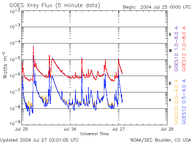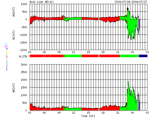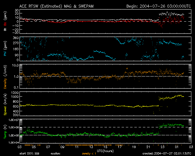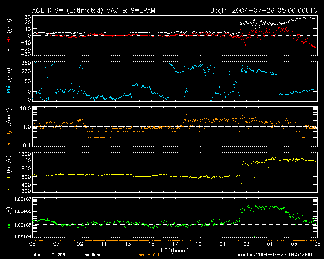 ACEが観測した太陽風の磁場(1番上の枠、白線は全体の強度、赤線は南北成分) および、太陽風の密度(3番目の橙線)、速度(4番目の黄線) (c) NOAA/SEC ![]() リアルタイムAE指数 下段のAEグラフの値が高くなると、オーロラ活動が活発化しています。 (c) 京都大学, NICT ![]() SOHO衛星のMDIカメラによる太陽黒点 (c) SOHO (ESA & NASA) ![]() GOES衛星の太陽X線データ (c) NOAA/SEC ![]() 2004/ 7/27 13:55 追加 ACEが観測した太陽風の磁場(1番上の枠、白線は全体の強度、赤線は南北成分) および、太陽風の密度(3番目の橙線)、速度(4番目の黄線) (c) NOAA/SEC ![]() | ||||||||||||||||||||||||||||||||||||||||