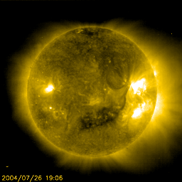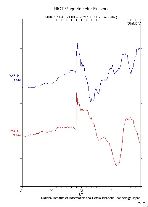 2004/ 7/27 11:01 更新 太陽風の衝撃波が来ました。太陽風は非常に高速です(1000km/秒)。磁気嵐の発達に注意が必要です。 2004/ 7/27 13:55 追加 太陽風磁場の南向きが強まって来ました。擾乱が激しくなると予想されます。 担当 篠原 今朝、27日7:48(世界時28日22:48)頃、太陽風の衝撃波が地球に到達しました。 これは昨日のニュースでお知らせしていた、 26日0時(世界時25日15時)の中規模フレアに伴うCME(太陽ガスの放出現象)によるものです。 予想よりもかなり早い到着で、衝撃波がかなり高速であることを示しています。 衝撃波が地球に到来した事を示す現象として、 太平洋のヤップ島の観測所(青線)で50nTの磁場の増加が、 ブラジルのサンタマリア観測所(赤線)では70nTの磁場の増加が地上で観測されています。 ACE衛星の観測によると、太陽風の速度は600km/秒から一気に900km/秒へ上昇しました (ACE衛星の図の4列目黄色線)。 速度はその後も上昇を続け、現在1000km/秒を越えています。 また、太陽風の磁場強度は15〜20nTへ強まっています(ACE衛星1列目の白線)。 現時点では、北寄りを中心に激しく変化している状態で、南向き成分があまり強く現れていません (ACE衛星1列目の赤線。プラスは北向き、マイナスは南向きを示している)。 磁気嵐など、磁気圏の擾乱の発達を決める大きな要素が、この太陽風磁場の南向き成分です。 今後、南向きに大きく振れる様になると、速度が非常に高速なため、擾乱も非常に大きくなるでしょう。 逆に、このまま北寄りに推移した場合、速度が非常に高速ですのである程度擾乱は発達するでしょうが、 大規模な現象にはなりにくいと思われます。 AE指数のグラフを見ると、 衝撃波の到来によって、オーロラ地帯の活動が非常に活発になっています。 今後の活動度は太陽風磁場の変化に大きく影響を受けるでしょう。 太陽黒点の652群はやや規模を縮小しつつある様です。 それでもまだまだ大規模であり、Mクラスの中規模フレアも頻繁に起こしています。 また、SOHO EIT284カメラの太陽画像を見ると、 太陽中心の南寄りに大きなコロナホールが見えています(暗く見えている領域)。 今回の高速太陽風に続いてこのコロナホールの影響が地球に及ぶとすると、 太陽風の高速状態が長く続く可能性もあります。 2004/ 7/27 13:55 追加 (篠原) 関連の図はページの最後にあります ACE衛星の観測によると、 27日12時(世界時27日3時)頃から太陽風磁場の南向きが急激に強まっています。 現在、-20nTとかなり強く南を向いています。 磁場強度は25nTに達していますので、このレベルまで強まる可能性もあります。 太陽風の速度は依然1000km/秒と非常に高速で、 このまま太陽風磁場の強い南向きが続いた場合、磁気圏の乱れは非常に大きくなるでしょう。 27日7:48(世界時28日22:48)に地上で観測された太陽風衝撃波の到来。太平洋ヤップ島と、ブラジルのサンタマリア観測所のデータ。 (c) NICT ![]() SOHO衛星のEIT284カメラの映像 (c) SOHO (ESA & NASA)