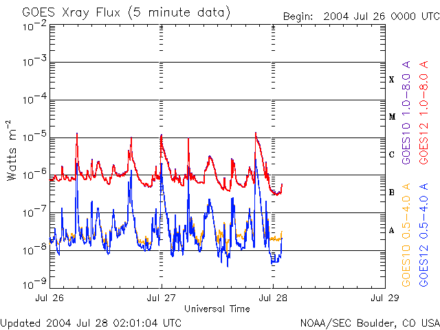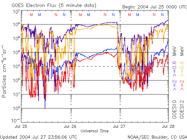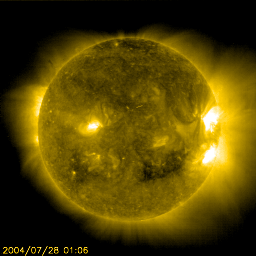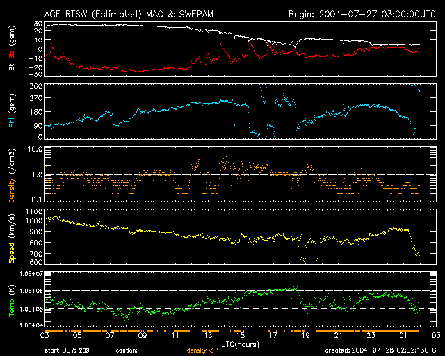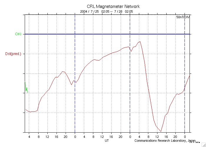 2004/ 7/28 11:03 更新 太陽風の乱れは収まりつつあります。磁気圏の活動も次第に低下するでしょう。 担当 篠原 昨日の朝(27日7:48、世界時26日22:48)の太陽風の衝撃波以降、 太陽風が非常に高速(1000km/秒)になり、磁場が大きく南を向いた(-25nT)ため、 地球の磁気圏が大きく乱れました。 磁気嵐が発達し、Dst指数は-200nT(下がる程磁気嵐は発達している)に達しました。 参考のため、NICTのDst予測のグラフを掲載します。 オーロラの活動を示すAE指数も変動が激しく、 最大で2000nTを越え、1000nTを前後する活動が連続的に観測されています。 磁気圏の大きな乱れをもたらした、 太陽風磁場の強い南向きは27日23時(世界時27日14時)頃に終わりました。 25nTあった磁場強度が10nT程度にまで弱まり、南向きの強さも弱まっています。 それとともに磁気嵐の発達も終わり、現在は回復に向かっています(Dstの図を参照)。 太陽風の速度は依然700km/秒を越えています。 南向き磁場も弱まったとはいえ、-5nT程度の成分が現れたり消えたりしています。 このため、オーロラ活動は現在も活発に続いている様です。 衝撃波に伴う高速太陽風は次第に収まって行くでしょう。 一方、SOHO EIT284の太陽画像を見ると、太陽の中心やや南寄り(下寄り)にコロナホールが見えており、 こちらの影響による高速風が地球に当たる様になります。 このため、今後数日にわたって太陽風の速度がやや高い状態が続くかもしれません。 太陽面では、2週間に渡って激しい擾乱をもたらした太陽黒点の652群がいよいよ西に没しつつあります。 規模は次第に弱まっている様ですが、M1クラスの小さな中規模フレアは活発に起こしています。 大きな爆発を起こす可能性はかなり下がっていますが、完全に西に没するまでは注意が必要でしょう。 激しい磁気嵐のニュースが続いていましたが、 静止軌道で観測される放射線帯の高エネルギー電子の密度がかなり増加しています。 GOES10の青線は警戒線と言われる10の4乗を越えており、 GOES12の赤線もこの線に達しつつあります。 磁気嵐は収まりつつありますが、衛星の運用では引き続き高エネルギー電子への注意が必要です。 ニューラルネットワークによるDst指数(赤道環電流)の予測(赤線)。 (c) NICT ![]() SOHO衛星のEIT284カメラの映像 (c) SOHO (ESA & NASA)