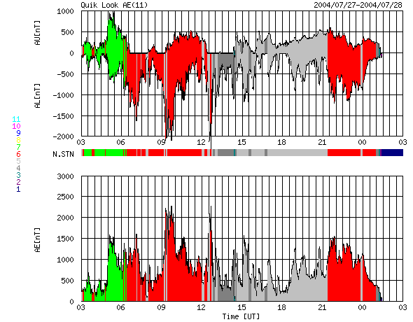 ACEが観測した太陽風の磁場(1番上の枠、白線は全体の強度、赤線は南北成分) および、太陽風の密度(3番目の橙線)、速度(4番目の黄線) (c) NOAA/SEC ![]() リアルタイムAE指数 下段のAEグラフの値が高くなると、オーロラ活動が活発化しています。 (c) 京都大学, NICT ![]() SOHO衛星のMDIカメラによる太陽黒点 (c) SOHO (ESA & NASA) ![]() GOES衛星の太陽X線データ (c) NOAA/SEC ![]() GOES衛星による、静止衛星軌道における高エネルギー電子の変化 (c) NOAA/SEC ![]() | ||||||||||||||||||||||||||||||||||||||||