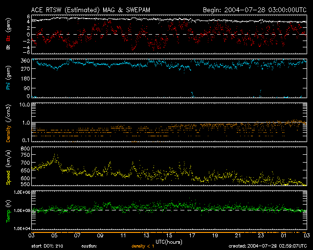 ACEが観測した太陽風の磁場(1番上の枠、白線は全体の強度、赤線は南北成分) および、太陽風の密度(3番目の橙線)、速度(4番目の黄線) (c) NOAA/SEC ![]() リアルタイムAE指数 下段のAEグラフの値が高くなると、オーロラ活動が活発化しています。 (c) 京都大学, NICT ![]() GOES衛星による、静止衛星軌道における高エネルギー電子の変化 (c) NOAA/SEC ![]() SOHO衛星のMDIカメラによる太陽黒点 (c) SOHO (ESA & NASA) ![]() GOES衛星の太陽X線データ (c) NOAA/SEC ![]() | |||||||||||||||||||||||||||||||||||||||||||||
