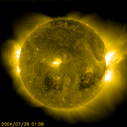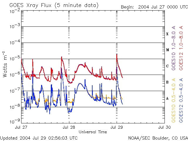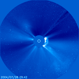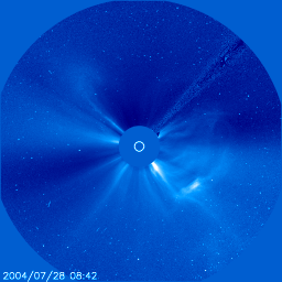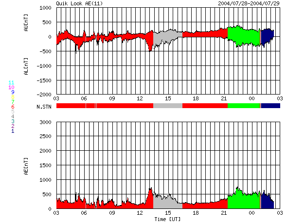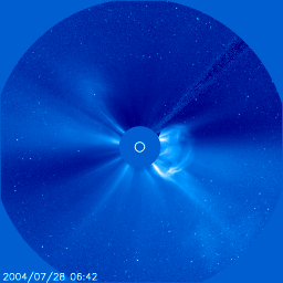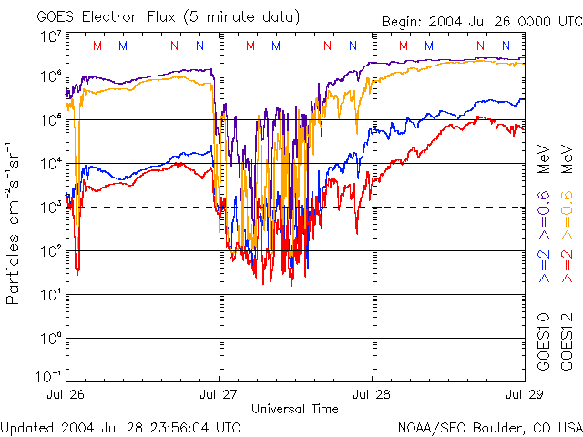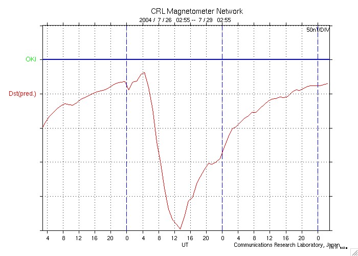 2004/ 7/29 11:59 更新 磁気嵐はほぼ終わりました。放射線帯電子の密度がとても増加しています。 担当 篠原 衝撃波が通過し、太陽風の速度も落ち着いて来ました。 現在は550km/秒とやや高速という程度です。 太陽風の磁場強度も4nTと通常のレベルに戻っています。 磁気嵐はほぼ終息しました。 磁気嵐の発達度を示すDst指数は-50nT程度にまで回復し、間もなく静穏レベルに戻るでしょう。 (参考のため、NICTによるDst指数の予測値を掲載しています) オーロラの活動を示すAE指数を見ると、500nT程度の弱い活動が見られています。 太陽風の速度がやや高いため、この程度の擾乱は起こり易い状態です。 SOHO EIT284カメラの太陽画像右下にコロナホールが見えています。 やや南に遠く外れていますが、ここから吹き出している高速太陽風の影響が地球に及ぶとすると、 太陽風のやや高速の状態はもうしばらく続くと考えられます。 今回の一連の磁気嵐に伴って、放射線帯の高エネルギー電子の密度がとても増加しています。 GOES衛星の観測によると、赤線・青線ともにピーク値で10の5乗を越える様になっています。 10の4乗が警戒を始める線ですので、その10倍に達している事になります。 衛星の運用で障害が発生する可能性が高まっています。 非常に活発に活動を続けていた652黒点群もいよいよ西の端に没しつつあります。 今日の黒点写真が最後の姿になるかもしれません。 この群は弱まりつつありますが、CからMクラスの小・中規模フレアを現在も頻繁に起こしています。 今朝も29日9時(世界時29日0時)にM2の中規模フレアを発生させました。 昨日、28日10時(世界時28日1時)頃に開始し、 28日15時(世界時28日6時)にピークに達したC4クラスの、大変長時間に及ぶフレアが観測されています。 このフレアに伴って、CME(太陽ガスの放出現象)がSOHO LASCO C3カメラで観測されました。 発生源の652黒点群が太陽面の西に寄っているため、ガスのほとんどは画面の右側へ飛び出しています。 この高速のガスの一部が、明日の夜以降に地球へ到達するかもしれません。 この場合、磁気圏に擾乱が起きる可能性がありますが、 吹き出したガスの端の方なので、小規模な擾乱に留まるでしょう。 ニューラルネットワークによるDst指数(赤道環電流)の予測(赤線)。 (c) NICT ![]() SOHO衛星のEIT284カメラの映像 (c) SOHO (ESA & NASA)