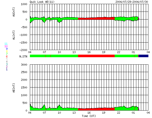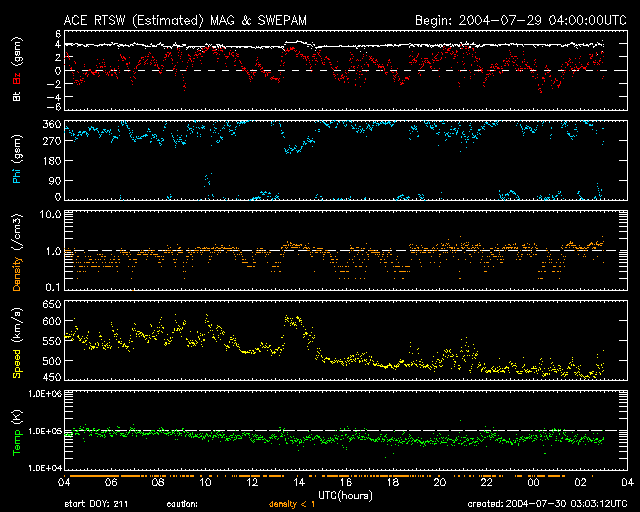 ACEが観測した太陽風の磁場(1番上の枠、白線は全体の強度、赤線は南北成分) および、太陽風の密度(3番目の橙線)、速度(4番目の黄線) (c) NOAA/SEC ![]() リアルタイムAE指数 下段のAEグラフの値が高くなると、オーロラ活動が活発化しています。 (c) 京都大学, NICT ![]() GOES衛星による、静止衛星軌道における高エネルギー電子の変化 (c) NOAA/SEC ![]() SOHO衛星のMDIカメラによる太陽黒点 (c) SOHO (ESA & NASA) ![]() GOES衛星の太陽X線データ (c) NOAA/SEC ![]() | ||||||||||||||||||||||||||||||||||||||||