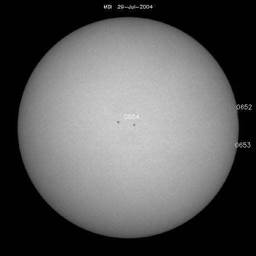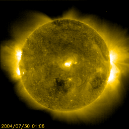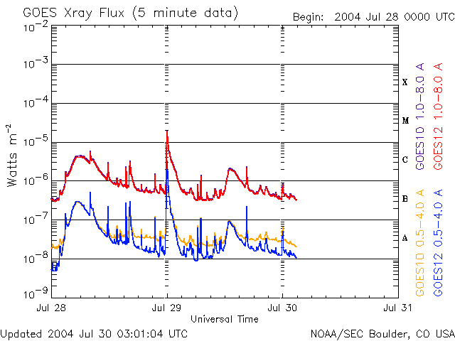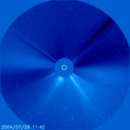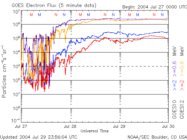 2004/ 7/30 12:04 更新 磁気圏は穏やかです。放射線帯の高エネルギー電子の密度が非常に高まっています。 担当 篠原 ACE衛星の観測によると、太陽風の速度はほぼ静穏レベルの450km/秒に下がりました。 磁気圏も穏やかになっています。 参考のためにNICTのDst予測のグラフを掲載していますが、ほぼ静穏レベル(青線)に戻っています。 オーロラ活動もすっかり穏やかになり、AE指数のグラフにはほとんど変化が見られなくなりました。 一方、放射線帯の高エネルギー電子の密度が非常に高まっています。 今日にかけて更に電子密度が増加し、 GOES10(青線)、GOES12(赤線)の両方の静止衛星で10の5乗の線を越えています。 衛星の運用において障害が発生しやすい状態が続いています。 減少するまで、しばらくの間注意が必要でしょう。 昨日のニュースでお知らせしましたが、28日15時(世界時28日6時)にピークに達したC4のフレアによる CME(太陽ガスの放出現象)の高速太陽風が今夜以降地球に到達する可能性があります。 オーロラが活発になったり、小規模な磁気嵐を発生させる可能性があります。 652黒点群は、太陽の裏側に回り込み、とうとう見えなくなってしまいました。 この黒点群が見えなくなる直前の、 29日21時(世界時29日12時)頃にC2の小規模フレアを発生させました。 フレアとしては小さかったのですが、美しいCMEを発生させています。 SOHO衛星LASCO C3による観測画像を掲載します。 太陽の西の端で発生したので、地球への影響はほとんど無いでしょう。 SOHO衛星LASCO C3カメラによる、29日21時(世界時29日12時)のCME(太陽ガスの放出)の様子。 (c) ESA & NASA ![]() ニューラルネットワークによるDst指数(赤道環電流)の予測(赤線)。 (c) NICT ![]() SOHO衛星のEIT284カメラの映像 (c) SOHO (ESA & NASA)