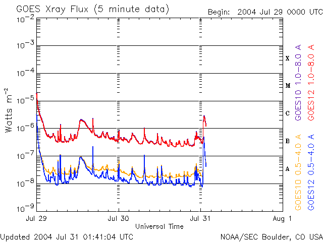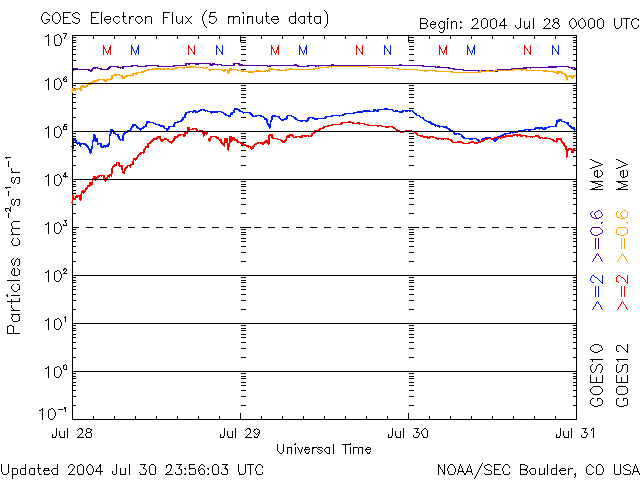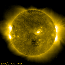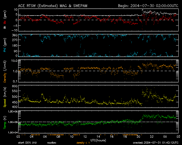 2004/ 7/31 10:41 更新 衝撃波が来ましたが、小規模でした。放射線帯の高エネルギー電子の密度が高いです。 担当 篠原 今朝、31日6時(世界時30日21時)頃、昨日までお知らせしていた太陽風の衝撃波が地球に来ました。 ACE衛星の観測によると衝撃波は小規模で、 太陽風の速度は450km/秒から550km/秒に増加した程度です。 太陽風磁場の増加もわずかで、地球の磁気圏への影響はほとんどありませんでした。 オーロラの活動を示すAE指数では、 31日7時(世界時30日22時)頃に小さな盛り上がりが見られた程度です。 太陽風の速度は既に450〜500km/秒程度に下がっており、今後も影響はほとんど無いでしょう。 放射線帯の高エネルギー電子の密度が非常に高い状態が現在も続いています。 GOES衛星の観測によると、電子密度はやや減少していますが、依然10の5乗程度を保っています。 衛星運用などでは引き続き注意が必要でしょう。 太陽面もまたすっかり穏やかになってしまいました。 黒点は、654群と東の端に655群(番号は書かれていません)が小さく見えている程度です。 フレア(太陽爆発)活動も穏やかになりました。 今朝31日10時(世界時31日1時)にC3の小規模フレアが起きていますが、 これは太陽の裏面に回り込んだ652群の活動に関連した現象です。 SOHO衛星のEIT284カメラの映像 (c) SOHO (ESA & NASA)