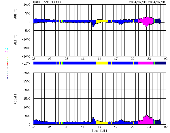 ACEが観測した太陽風の磁場(1番上の枠、白線は全体の強度、赤線は南北成分) および、太陽風の密度(3番目の橙線)、速度(4番目の黄線) (c) NOAA/SEC ![]() リアルタイムAE指数 下段のAEグラフの値が高くなると、オーロラ活動が活発化しています。 (c) 京都大学, NICT ![]() GOES衛星による、静止衛星軌道における高エネルギー電子の変化 (c) NOAA/SEC ![]() SOHO衛星のMDIカメラによる太陽黒点 (c) SOHO (ESA & NASA) ![]() GOES衛星の太陽X線データ (c) NOAA/SEC ![]() | ||||||||||||||||||||||||||||||||||||||||