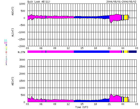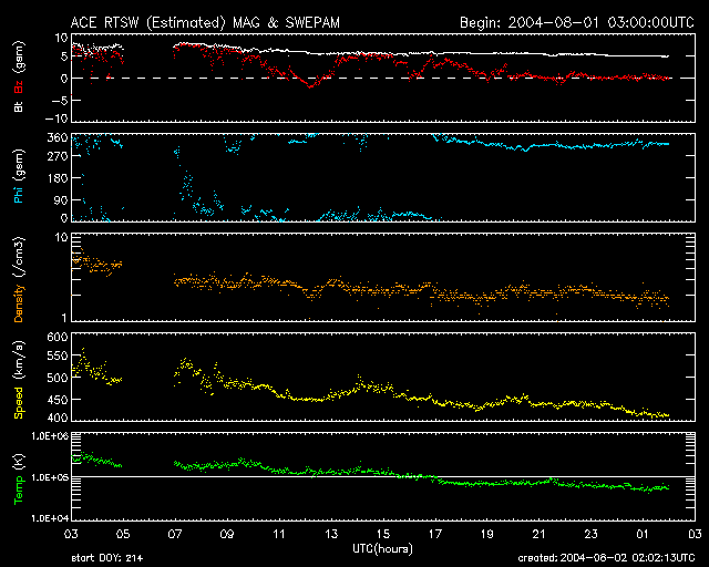 ACEが観測した太陽風の磁場(1番上の枠、白線は全体の強度、赤線は南北成分) および、太陽風の密度(3番目の橙線)、速度(4番目の黄線) (c) NOAA/SEC ![]() リアルタイムAE指数 下段のAEグラフの値が高くなると、オーロラ活動が活発化しています。 (c) 京都大学, NICT ![]() GOES衛星による、静止衛星軌道における高エネルギー電子の変化 (c) NOAA/SEC ![]() SOHO衛星のMDIカメラによる太陽黒点 (c) SOHO (ESA & NASA) ![]() GOES衛星の太陽X線データ (c) NOAA/SEC ![]() | ||||||||||||||||||||||||||||||||||||||||