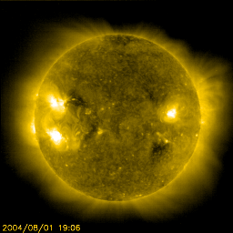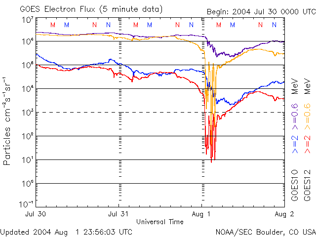 2004/ 8/ 2 11:01 更新 太陽風、磁気圏ともに穏やかです。放射線帯高エネルギー電子は高密度が続いています。 担当 篠原 太陽面の裏側に回り込んだ652黒点群が、美しいプロミネンスを見せていました。 SpaceWeater.comの8月1日の記事に美しい動画が紹介されていますが(こちらもご覧下さい)、 SOHO衛星のEIT195カメラが撮影したこのプロミネンスを、 7月31日6:48〜19:26(世界時)の写真を組み合わせて動画にしました。 画像サイズが大きくなってしまいましたが、ダイナミックな太陽の姿をご覧下さい。 昨日、1日11時(世界時1日2時)頃に、ACE衛星で小規模な太陽風の衝撃波が観測されました。 これは7月30日付のニュースでお知らせしていたCME(太陽ガスの放出現象)によるものと思われます。 CMEの発生箇所が太陽面の西の端でしたので、 太陽風の速度が450km/秒から550km/秒に増加した程度の、小規模な変化しか見られませんでした。 この衝撃波は1日11時半(世界時1日2時半)頃地球に到達し、オーロラ活動をやや活発にした様です。 AE指数が500nT程度に変化していました。 太陽風は速度もすぐに低下し、現在は400km/秒と通常の速度に戻っています。 磁気圏も概ね穏やかです。 AE指数の、最新の時間帯に500nT程度の小規模な変化が現れていますが、 大きな活動に繋がる事はありません。 SOHO EIT284の太陽画像には目立ったコロナホールも無く、 しばらくは穏やかな太陽風が続きそうです。 放射線帯の高エネルギー電子は、減少し続けているものの現在も密度の高い状態が続いています。 GOES衛星の観測では、ようやく10の4乗の線を切りつつあるところです。 太陽面には黒点群が2つ見えています。 どちらも小規模で、フレア(太陽爆発)の活動はほとんどありません。 太陽面裏側に回った652黒点群が見せた、美しいプロミネンス。7月31日6:48〜19:26(世界時)。 (c) ESA & NASA ![]() SOHO衛星のEIT284カメラの映像 (c) SOHO (ESA & NASA)