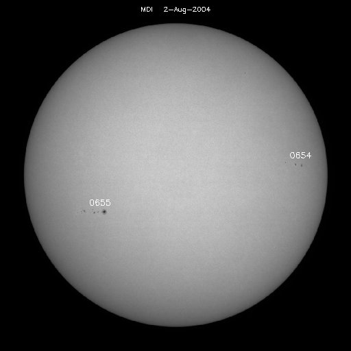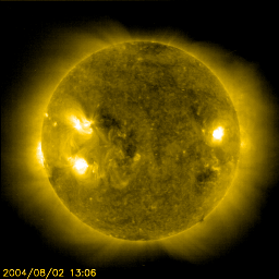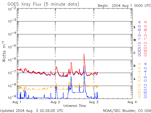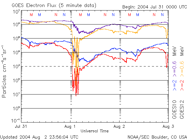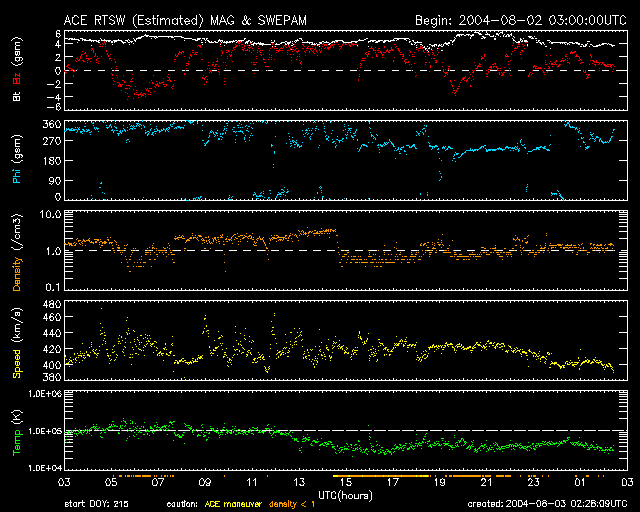 2004/ 8/ 3 11:29 更新 放射線帯高エネルギー電子の密度が高いです。太陽、太陽風、磁気圏は穏やかです。 担当 篠原 放射線帯の高エネルギー電子は昨日よりも密度が上昇し、GOES10、12の両衛星で10の4乗を越えています。 この線を越えると、人工衛星に支障が発生する可能性が高くなります。 引き続き数日に渡って警戒ラインを越えた状態が続くと思われますので、ご注意下さい。 太陽風は速度400km/秒(ACEデータの黄色線)、磁場強度約4nT(白線)と穏やかな状態が続いています。 磁場の南北成分(赤線)は北向きが主で、時折南向きが2時間程度現れたりしています。 磁気圏も概ね静穏で、オーロラの活動を示すAE指数のグラフを見ても、 500nT程度の小さな変化が短時間見られた程度です。 (このオーロラ活動は、太陽風の磁場が南を向いた(赤線がマイナスになった)後に発生しています) SOHO衛星のEIT284カメラの太陽画像を見ると、 中央からやや左寄り(東寄り)に少し暗くなっている部分が見られます。 あまりはっきりしないのですが、ここにコロナホールがある様です。 コロナホールとは太陽の磁場が外に向かって開いている場所で、ここから速い太陽風が吹き出しています。 この高速風が地球に当たると、オーロラ活動が活発になったり、磁気嵐が起こったりします。 コロナホールが太陽の中心を過ぎて、3〜4日ほど経つと高速風が地球に当たる様になります。 そうなるまでに、あと4〜5日ほどかかりそうです。 太陽面では654、655の黒点群が見えています。 どちらも規模は小さいですが、655群がC4程度の小規模フレア(太陽爆発)を起こしています。 SOHO衛星のEIT284カメラの映像 (c) SOHO (ESA & NASA)