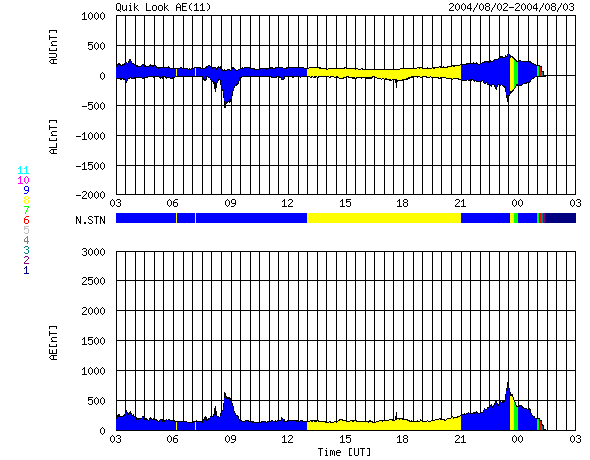 GOES衛星による、静止衛星軌道における高エネルギー電子の変化 (c) NOAA/SEC ![]() ACEが観測した太陽風の磁場(1番上の枠、白線は全体の強度、赤線は南北成分) および、太陽風の密度(3番目の橙線)、速度(4番目の黄線) (c) NOAA/SEC ![]() リアルタイムAE指数 下段のAEグラフの値が高くなると、オーロラ活動が活発化しています。 (c) 京都大学, NICT ![]() SOHO衛星のMDIカメラによる太陽黒点 (c) SOHO (ESA & NASA) ![]() GOES衛星の太陽X線データ (c) NOAA/SEC ![]() | ||||||||||||||||||||||||||||||||||||||||