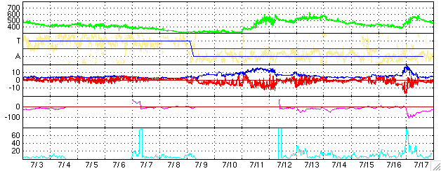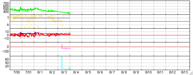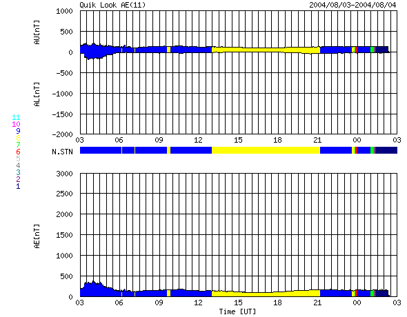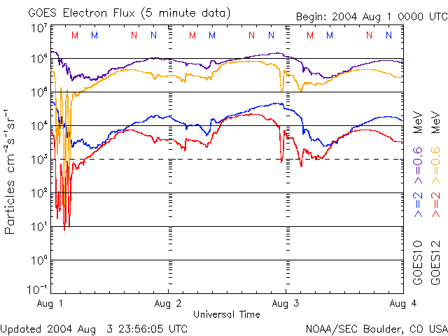 ACEが観測した太陽風の磁場(1番上の枠、白線は全体の強度、赤線は南北成分) および、太陽風の密度(3番目の橙線)、速度(4番目の黄線) (c) NOAA/SEC ![]() リアルタイムAE指数 下段のAEグラフの値が高くなると、オーロラ活動が活発化しています。 (c) 京都大学, NICT ![]() GOES衛星による、静止衛星軌道における高エネルギー電子の変化 (c) NOAA/SEC ![]() 27日の太陽周期に合わせたデータプロット (太陽風版) 太陽が同じ面を地球に向けていた27日前の変化から、今後を予想することができます。 (c) NICT