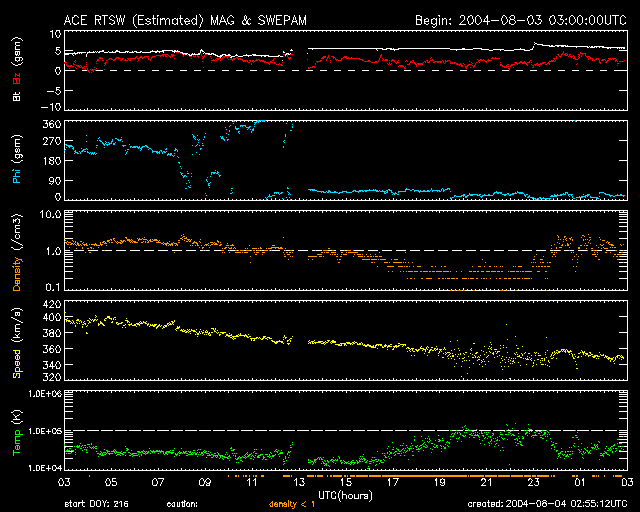 2004/ 8/ 4 11:56 更新 太陽風の速度は遅く、磁気圏は穏やかです。放射線帯高エネルギー電子は減少を続けています。 担当 篠原 太陽風の速度は次第に低下し、350km/秒まで下がっています。 太陽風の磁場強度は5nTで、北寄りを向いています。 このため地球の磁気圏はたいへん穏やかで、 オーロラの活動を示すAE指数のグラフには全く変化が見られません。 1週間以上高い状態が続いている、放射線帯の高エネルギー電子密度ですが、 緩やかに減少を続けています。 もう1〜2日程度で警戒ラインを切るまでに下がりそうです。 SOHO衛星EIT284カメラの太陽画像では、コロナホールが太陽のほぼ中心に来ています。 今後の太陽風を予想するために、27日周期の図を掲載します。 太陽は27日で一回転し、同じ面を地球に向けることになります。 このため、コロナホールなどの影響は27日周期で現れる事が多くなります。 27日前の宇宙天気の変化を調べると、今後の天気予想を立てる事ができるのです。 コロナホールが中心に達しましたので、これから3〜4日後に太陽風の速度が高くなる事が予想されます。 27日前の変化を調べると、上の段の7月11日から太陽風の速度が上昇しています(緑色の線)。 従って、今周期も8月7日頃から太陽風の速度上昇が見られそうです。 一方、27日前の図からは7月9日にセクターの切り替わりがあり(上の段の2列目の青線)、 つづいて太陽風の磁場強度が上昇していた(上の段の3列目の青線)事が分かります。 この変化が今周期も見られるとすると、明日にセクターの切り替わりが起こり、 その後次第に磁場強度が上昇すると予想されます。 続いて太陽風の速度が上昇するために、一時的にオーロラ活動が活発になると思われます。 太陽面では、黒点の655群がやや発達しています。 しかし、規模としては小さいですので、大きなフレア(太陽爆発)は発生しないでしょう。 SOHO衛星のEIT284カメラの映像 (c) SOHO (ESA & NASA)