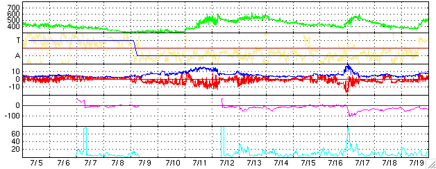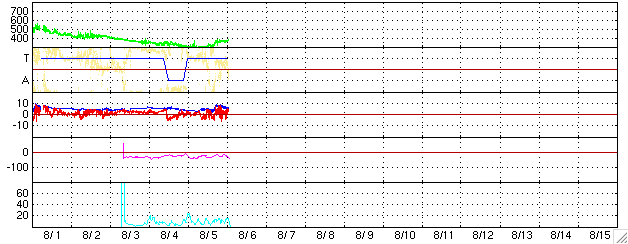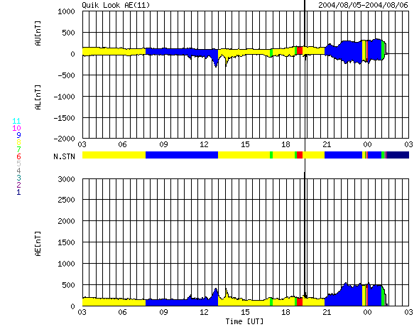 ACEが観測した太陽風の磁場(1番上の枠、白線は全体の強度、赤線は南北成分) および、太陽風の密度(3番目の橙線)、速度(4番目の黄線) (c) NOAA/SEC ![]() リアルタイムAE指数 下段のAEグラフの値が高くなると、オーロラ活動が活発化しています。 (c) 京都大学, NICT ![]() 27日の太陽周期に合わせたデータプロット (太陽風版) 太陽が同じ面を地球に向けていた27日前の変化から、今後を予想することができます。 (c) NICT