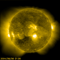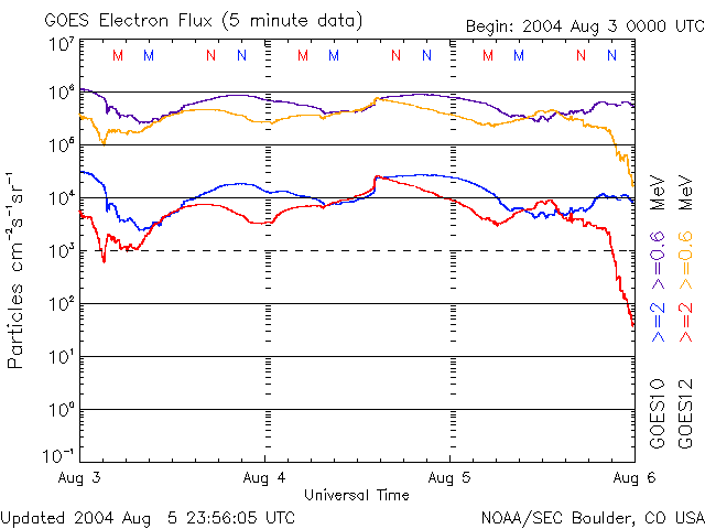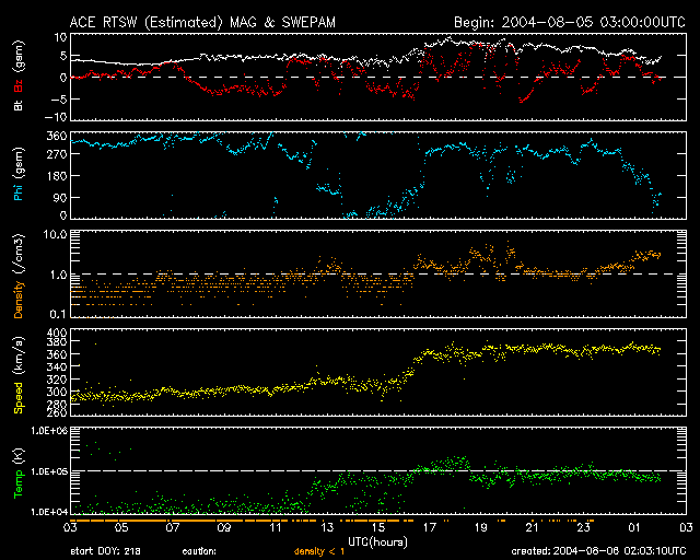 2004/ 8/ 6 11:04 更新 太陽風速度と磁場強度がやや上昇しています。磁気圏は穏やかです。 担当 篠原 6日1時(5日16時)頃から太陽風の速度がやや上昇し、300km/秒から380km/秒になりました。 上昇した後でも静穏レベルですので、地球への大きな影響は出ていません。 同時に磁場強度もやや上昇し、南北に振れる事も見られています。 このためか、AE指数には500nT程度の弱い変化が見られます。 昨日お伝えしたセクター境界の切り替わりですが、 一時的な乱れだった様で、現在は再び前の状態に戻っています。 27日周期の図を示していますが、 太陽風の速度や磁場の変化について前周期との違いが少しずつ見えて来ています。 今後、コロナホールによる小幅の速度上昇が予想されていますが、 前周期とどのように変わっているか興味が持たれます。 放射線帯の高エネルギー電子の密度が低下しました。 赤と青の線が、警戒ラインと言われる10の4乗を下回る様になりました。 太陽のフレア(太陽爆発)活動はたいへん穏やかです。 太陽の中心やや下に小さく655黒点群が見えています。 SOHO衛星のEIT284カメラの映像 (c) SOHO (ESA & NASA)