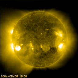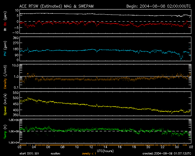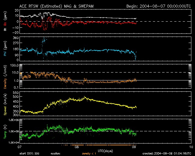2004/ 8/ 9 10:58 更新 7日から8日にかけて、太陽風の速度が500km/秒まで上昇しました。現在は下がり、静穏です。 担当 篠原 昨日は休載となりましたことをお詫び致します。 一昨日のニュースで太陽風磁場の強度が強まりつつある事をお伝えしましたが、 その後、7日19時(世界時7日10時)頃から太陽風の速度が上昇を始めました。 太陽風は1日に渡ってやや高速となり、速度450km/秒を越えた(最高は約500km/秒)状態が続きました。 太陽風データとして、3日幅の図を最初に掲載しています。横軸の数字は日付となっています。 太陽風磁場が-10nTとやや大きく南を向く時間帯もありましたが、 速度があまり高速でなかったためか、磁気圏への影響は小さく、 AE指数では500nTを越える小規模なオーロラ活動が見られた程度です。 8日12時(世界時8日3時)以降、太陽風の速度は緩やかに低下し、 現在は400km/秒と通常レベルにもどっています。 27日周期の図を見ると、速度上昇の開始時間は前回と同じくらいでしたが、 高速風の継続時間、その前に見られた磁場強度の上昇の様子などはかなり変わっています。 コロナホールの分布が前周期から大きく変わったためでしょう(8月5日の記事を参照)。 SOHO EIT284カメラの太陽画像では、太陽の南西(右下)寄りにやや広く、 コロナホール(薄暗くなっている領域)が見えています。 しかし、このコロナホールはかなり南に外れていますので、地球への影響はほとんどないでしょう。 それ以外にコロナホールは見られず、しばらくは穏やかな状態が続きそうです。 太陽面では、656群が東側(左側)で目立っています。 今日に入ってから、Cクラスの小規模フレアを3回程度起こしています。 引き続き、Mクラスの中規模フレアを発生させる可能性がある様です。 ACE衛星による、3日幅の太陽風の図。1列目は磁場強度(白線)と南北成分(赤線)。4列目は速度。 (c) NOAA/SEC ![]() SOHO衛星のEIT284カメラの映像 (c) SOHO (ESA & NASA)