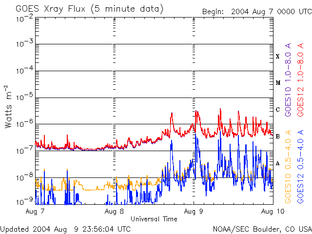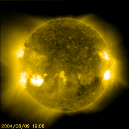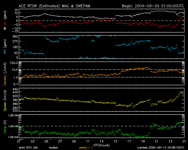 2004/ 8/10 09:58 更新 太陽風磁場が強まり、磁気圏の活動がやや活発になっています。656黒点群が小さなフレアを盛んに起こしています。 担当 篠原 10日1時(世界時9日15時)頃から太陽風の状態が変化を始めています。 磁場強度が5nT〜10nT程度に強まりました(ACEデータ1列めの白線)。 また、主に南向きの成分を持つようになっています(1列め赤線のマイナス成分)。 このため、磁気圏へのエネルギー流入が強まり、AE指数に500nT前後の弱い活動が観測されています。 太陽風の速度が360km/秒程度で遅かったため、大きな活動にはなっていません。 続いて、10日9時(世界時10日0時)から太陽風磁場が急に北寄りに変わり、 それとともに太陽風速度が上昇を始め、現在420km/秒に達しています。 昨日のニュースで記しましたが、太陽面南側のコロナホールの影響が見られているのかもしれません。 磁場強度が強まった事に続いて、これから太陽風速度がもう一段階上昇する可能性があります。 コロナホールの位置から考えてあまり高速にはならないと思いますが、しばらく注意が必要です。 再び、太陽風磁場が南向きを持つ様になると、オーロラ活動が活発になると予想されます。 太陽黒点では656群が成長を続けています。 小さいCクラスの小規模フレアを、昨日のニュース以後10数回にわたって発生させています。 今後も中・小規模のフレアを、 また黒点群として更に成長を続けた場合は大規模フレアを起こす可能性もある様です。 こちらも注目する必要があります。 SOHO衛星のEIT284カメラの映像 (c) SOHO (ESA & NASA)