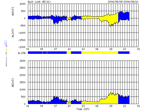 ACEが観測した太陽風の磁場(1番上の枠、白線は全体の強度、赤線は南北成分) および、太陽風の密度(3番目の橙線)、速度(4番目の黄線) (c) NOAA/SEC ![]() リアルタイムAE指数 下段のAEグラフの値が高くなると、オーロラ活動が活発化しています。 (c) 京都大学, NICT ![]() SOHO衛星のMDIカメラによる太陽黒点 (c) SOHO (ESA & NASA) ![]() GOES衛星の太陽X線データ (c) NOAA/SEC ![]() | ||||||||||||||||||||||||||||||||||||||||