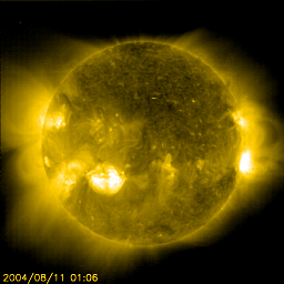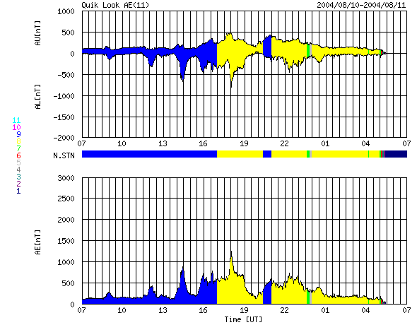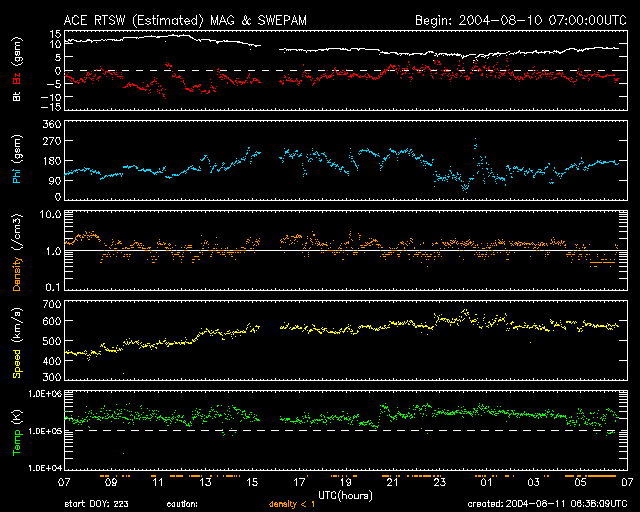 2004/ 8/11 15:38 更新 太陽風が高速(600km/秒)で、オーロラ活動がやや活発になっています。 担当 篠原 ACE衛星の観測によると、太陽風の速度は600km/秒前後と高速で推移しています。 昨日のニュースに続く様に、太陽風の速度が緩やかに上昇を続けたためです。 太陽風の磁場は一時13nTにまで強まりました。南向き成分も-5〜-10nT程度が続き、 オーロラ活動はAE指数で500nT強とやや活発な状態になっていました。 11日6時(世界時10日21時)頃から磁場強度、南向き成分ともに弱まり、 オーロラ活動も穏やかになっています。 太陽面の写真では、コロナホールの様子は分かりにくくなっています。 見にくいですが太陽の正面北寄りにコロナホールが見られるとするデータもあり、 今後の展開はやや読みにくくなっています。 もう数日高速風が続き、しばらくの間磁気圏がやや活発な状態が続く可能性があります。 太陽黒点656群のフレア活動(太陽爆発)は昨日より低下していますが、 黒点の規模は大きく保っており、今後も中規模のフレアを起こす可能性があります。 SOHO衛星のEIT284カメラの映像 (c) SOHO (ESA & NASA)