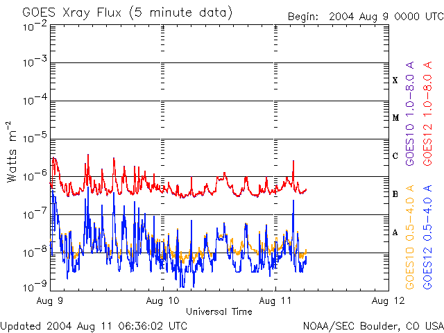 ACEが観測した太陽風の磁場(1番上の枠、白線は全体の強度、赤線は南北成分) および、太陽風の密度(3番目の橙線)、速度(4番目の黄線) (c) NOAA/SEC ![]() リアルタイムAE指数 下段のAEグラフの値が高くなると、オーロラ活動が活発化しています。 (c) 京都大学, NICT ![]() SOHO衛星のMDIカメラによる太陽黒点 (c) SOHO (ESA & NASA) ![]() GOES衛星の太陽X線データ (c) NOAA/SEC ![]() | ||||||||||||||||||||||||||||||||||||||||