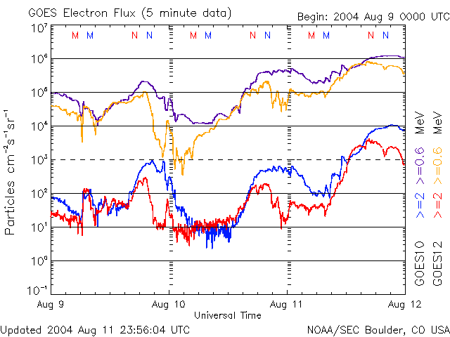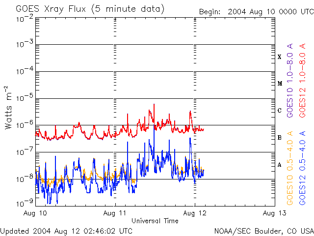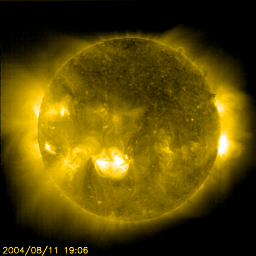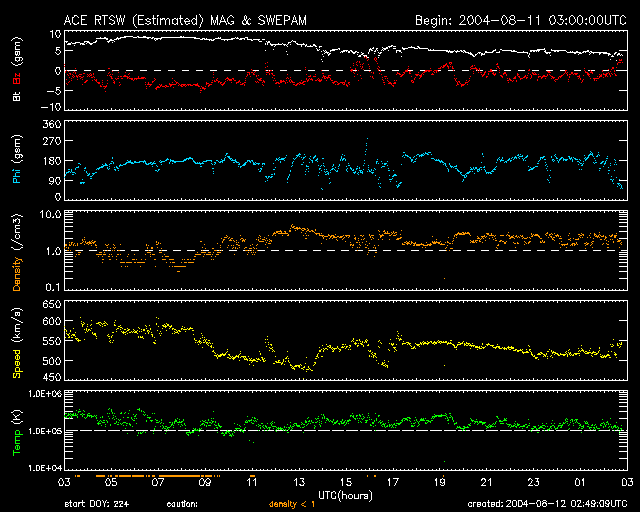 2004/ 8/12 11:49 更新 太陽風の速度はやや高速(500km/秒)で、磁気圏はやや活動的です。656黒点群が発達しています。 担当 篠原 高速太陽風は次第に速度を下げています。間もなくやや高速の500km/秒にまで下がりそうです。 SOHO EIT284の太陽画像では、コロナホールがはっきりしないのですが、 太陽面中央から右上のやや暗い領域に太陽風の吹き出しがあるとすると、 もう数日高速太陽風が続くかもしれません。 磁場強度は5nT。南向きの成分が現れたり、消えたりしています。 このため、多少オーロラ活動が見られており、 AE指数には500nT程度の変動が断続的に見られています。 しかし、太陽風の様子から、これ以上大規模な擾乱に発達する事はないでしょう。 この高速風の影響で、放射線帯の高エネルギー電子が増加しています。 まだ警戒ラインには達していませんが、今後の変化に注意が必要でしょう。 太陽面では656黒点群が発達を続けています。 Cクラスの小規模フレアを盛んに発生させるようになっており、 今後、Mクラスの中規模フレアを起こす事が予想されています。 場合によっては、Xクラスの大規模フレアを発生させるかもしれません。 太陽の中心にいますので、フレアに伴ってCME(太陽ガスの放出現象)を起こした場合は、 地球への影響は避けられないでしょう。 SOHO衛星のEIT284カメラの映像 (c) SOHO (ESA & NASA)