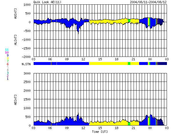ACEが観測した太陽風の磁場(1番上の枠、白線は全体の強度、赤線は南北成分) および、太陽風の密度(3番目の橙線)、速度(4番目の黄線) (c) NOAA/SEC ![]() リアルタイムAE指数 下段のAEグラフの値が高くなると、オーロラ活動が活発化しています。 (c) 京都大学, NICT ![]() GOES衛星による、静止衛星軌道における高エネルギー電子の変化 (c) NOAA/SEC ![]() SOHO衛星のMDIカメラによる太陽黒点 (c) SOHO (ESA & NASA) ![]() GOES衛星の太陽X線データ (c) NOAA/SEC ![]() | ||||||||||||||||||||||||||||||||||||||||