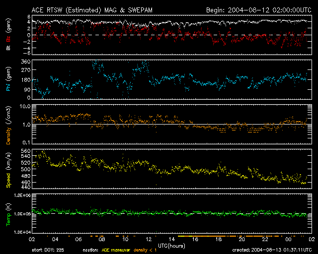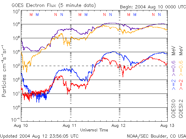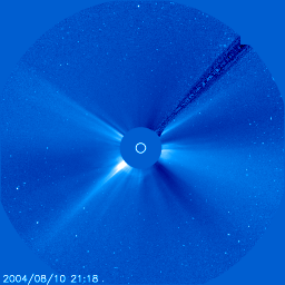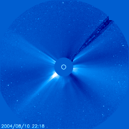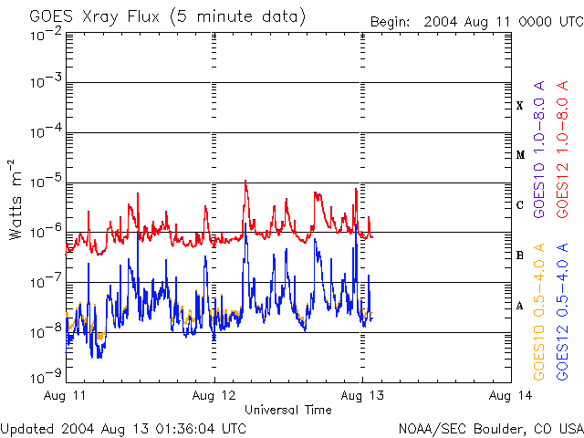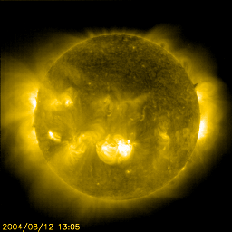 2004/ 8/13 10:35 更新 太陽風の速度は緩やかに低下を続けています。656黒点群が活発に活動しています。 担当 篠原 太陽黒点の656黒点群が更に発達を続けています。 フレア(太陽爆発)活動も活発で、 昨日以降もM1の中規模フレアからCクラスの小規模フレアを多数発生させています。 今後、Mクラスの中規模フレア、Xクラスの大規模フレアなどを起こす可能性があります。 太陽面の中心付近にありますので、 CME(太陽ガスの放出現象)が発生した場合は地球に磁気嵐などをもたらす可能性が高いです。 太陽風はゆるやかに速度が下がり続けています。 現在460km/秒まで下がり、通常の速度に戻りつつあります。 このため磁気圏もすっかり静かになり、 オーロラの活動を示すAE指数のグラフにはほとんど変化が見られません。 今後太陽風はしばらく穏やかになると思われますが、 SOHO LASCO C3カメラで11日6時(世界時10日21時)頃に淡いCMEが観測されています。 とても微かですが、この影響による太陽風の乱れが今夜以降に現れる可能性があります。 いずれにせよ小規模な乱れで、オーロラなどが一時的に活発になる程度でしょう。 放射線帯の高エネルギー電子の増加は止まっています。 警戒レベルを越える程には増えませんでした。 SOHO衛星のEIT284カメラの映像 (c) SOHO (ESA & NASA)