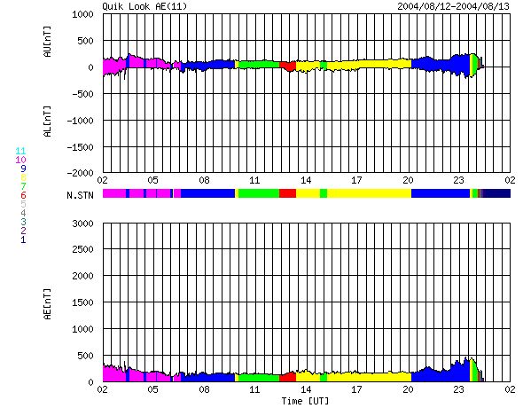 SOHO衛星のMDIカメラによる太陽黒点 (c) SOHO (ESA & NASA) ![]() GOES衛星の太陽X線データ (c) NOAA/SEC ![]() ACEが観測した太陽風の磁場(1番上の枠、白線は全体の強度、赤線は南北成分) および、太陽風の密度(3番目の橙線)、速度(4番目の黄線) (c) NOAA/SEC ![]() リアルタイムAE指数 下段のAEグラフの値が高くなると、オーロラ活動が活発化しています。 (c) 京都大学, NICT ![]() GOES衛星による、静止衛星軌道における高エネルギー電子の変化 (c) NOAA/SEC ![]() | |||||||||||||||||||||||||||||||||||||||||||