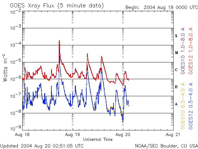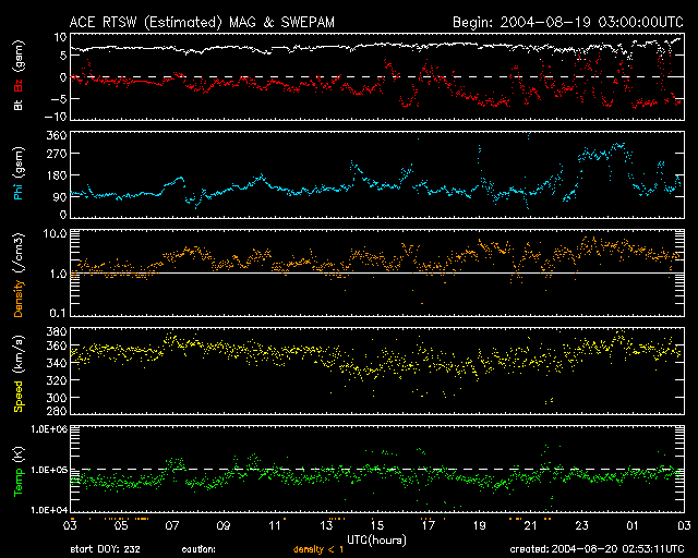 ACEが観測した太陽風の磁場(1番上の枠、白線は全体の強度、赤線は南北成分) および、太陽風の密度(3番目の橙線)、速度(4番目の黄線) (c) NOAA/SEC ![]() リアルタイムAE指数 下段のAEグラフの値が高くなると、オーロラ活動が活発化しています。 (c) 京都大学, NICT ![]() SOHO衛星のMDIカメラによる太陽黒点 (c) SOHO (ESA & NASA) ![]() GOES衛星の太陽X線データ (c) NOAA/SEC ![]() | ||||||||||||||||||||||||||||||||||||||||
