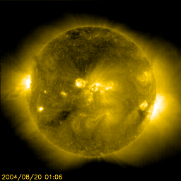 2004/ 8/20 11:54 更新 太陽風は低速で、磁気圏は穏やかです。太陽西縁できれいなプロミネンスが見えていました。 担当 篠原 656黒点群が西の端に沈んでいきました。 そのおかげで、プロミネンスの活動が美しく見えています。 約半日分の動きを動画にしました。 ファイルサイズが大きく(6MB)、通信環境によってはかなり負荷をかけてしまいますがご容赦下さい。 太陽風は速度が360km/秒と低速な状態が続いています。 結局コロナホールの影響はほとんどありませんでした。 磁場が-5nT程度南を向く状態が半日近く続いていますが、 速度が遅いためでしょうか、これまでは磁気圏の乱れは起きていませんでした。 しかし、AE指数の最後に乱れの始まりが見えています。 今後は活動がやや活発になるかもしれません。 SOHO EIT284の太陽画像を見ると、 中心やや上寄りと、左下に少し暗い部分が見えています。 共に小規模なコロナホールだと思われます。 上に見える領域は2〜3日後、下の領域は4〜5日後くらいから地球に影響が及ぶ位置に来ます。 (太陽の中心と、西の端の中間くらいが目安の場所です) 太陽風の速度に上昇が見られるかもしれません。 どちらも規模が小さいですので、上昇幅、継続時間などは小さいと思われます。 太陽面では、中心に661黒点群がどんと居座っています。 目立ってはいますが、活動はほとんど無く、656群が没した後はフレア(太陽爆発)活動は穏やかです。 太陽西縁の656黒点群が見せた、美しいプロミネンス。8月18日22:00〜19日12:00(世界時)。 (c) NOAA/SEC ![]() SOHO衛星のEIT284カメラの映像 (c) SOHO (ESA & NASA)