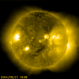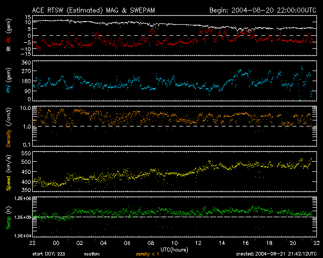 2004/ 8/22 06:43 更新 太陽風の速度がやや上昇しています(470km/秒)。 担当 篠原 ACE衛星の観測によると、 太陽風の速度は21日9時(世界時21日0時)頃から緩やかに上昇を始め 21日22時(世界時21日13時)頃に470km/秒に上がり、以後安定してこの速度が続いています。 通常の速度(およそ400km/秒)よりわずかに速い程度で、大きな変化ではありません。 SOHO EIT284の太陽画像を見ると、 太陽面北やや西(上やや右)に見られるコロナホール(やや暗くなっている部分)の影響と考えられます。 コロナホールの規模が小さいので、これ以上大きく速度が上昇することは無いでしょう。 太陽面南より(下より)にも小さなコロナホールが見えます。 続いてこちらの影響も考えられますので、やや速い状態は4日程度続くかもしれません。 昨日まで強まっていた太陽風の磁場は、速度の上昇とともに低下し、現在は5nTレベルに戻っています。 南寄りの主体の傾向は続いていて、速度がやや上昇したことと相まって、 オーロラ活動は少し活発になっています。 AE指数を見ると、500nTを越える規模の活動が幾度か観測されています。 さほど高速でもないので、これ以上の活動にはなりにくいでしょう。 太陽面では、黒点群が小さいながらも数多く散らばっていて、にぎやかです。 どれも規模が小さく、フレア(太陽爆発)活動は見られません。 SOHO衛星のEIT284カメラの映像 (c) SOHO (ESA & NASA)