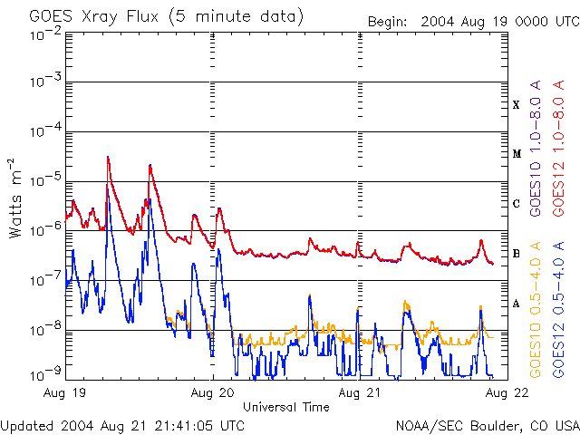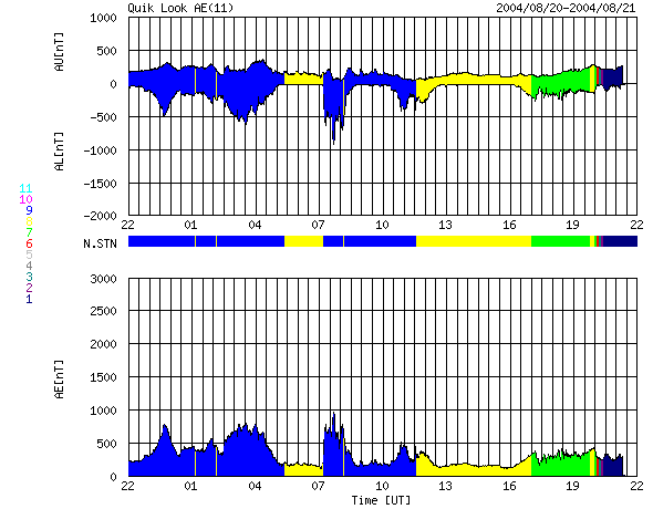 ACEが観測した太陽風の磁場(1番上の枠、白線は全体の強度、赤線は南北成分) および、太陽風の密度(3番目の橙線)、速度(4番目の黄線) (c) NOAA/SEC ![]() リアルタイムAE指数 下段のAEグラフの値が高くなると、オーロラ活動が活発化しています。 (c) 京都大学, NICT ![]() SOHO衛星のMDIカメラによる太陽黒点 (c) SOHO (ESA & NASA) ![]() GOES衛星の太陽X線データ (c) NOAA/SEC ![]() | ||||||||||||||||||||||||||||||||||||||||