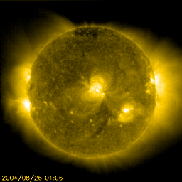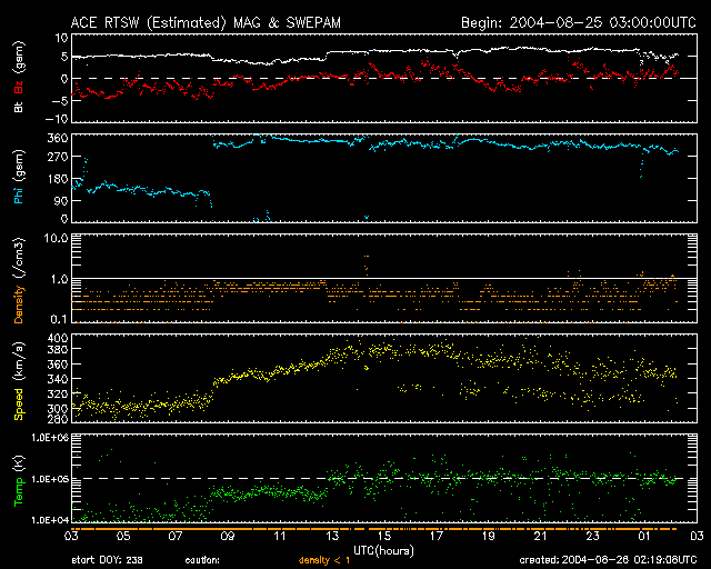 2004/ 8/26 11:20 更新 太陽風の速度は遅く、磁気圏は穏やかです。太陽黒点も少なくなっています。 担当 篠原 25日17時(世界時25日8時)頃から、太陽風の速度が少し増える傾向を示しました。 変化幅は小さいもので、300km/秒だった速度が6時間ほどかけて370km/秒に増加した程度です。 現在はやや下がって350km/秒になっています。 いずれにせよ、低速風であり、地球磁気圏への影響はありませんでした。 太陽風磁場は強度が5nT。南北成分はほとんど0の状態が続いています。 オーロラ活動のAE指数には変化はほとんどなく、地球磁気圏はたいへん静穏です。 SOHO EIT284の太陽画像も、小さな活動領域が明るく見えている以外は、 のっぺりした姿になっています。 昨日の記事で解説しましたように、当分穏やかな状態が続きそうです。 太陽黒点も661黒点群が没してしまったことと、 小さな群が消えてしまったため、寂しくなっています。 フレア活動(太陽爆発)は昨日小さいCクラスの小規模フレアがあった程度で、とても穏やかです。 SOHO衛星のEIT284カメラの映像 (c) SOHO (ESA & NASA)