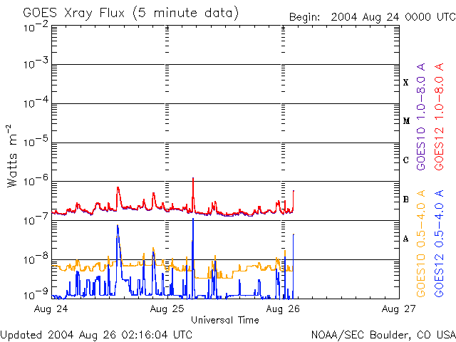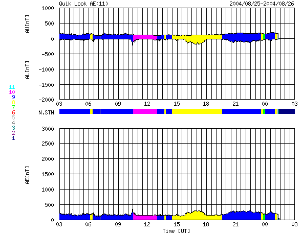 ACEが観測した太陽風の磁場(1番上の枠、白線は全体の強度、赤線は南北成分) および、太陽風の密度(3番目の橙線)、速度(4番目の黄線) (c) NOAA/SEC ![]() リアルタイムAE指数 下段のAEグラフの値が高くなると、オーロラ活動が活発化しています。 (c) 京都大学, NICT ![]() SOHO衛星のMDIカメラによる太陽黒点 (c) SOHO (ESA & NASA) ![]() GOES衛星の太陽X線データ (c) NOAA/SEC ![]() | ||||||||||||||||||||||||||||||||||||||||