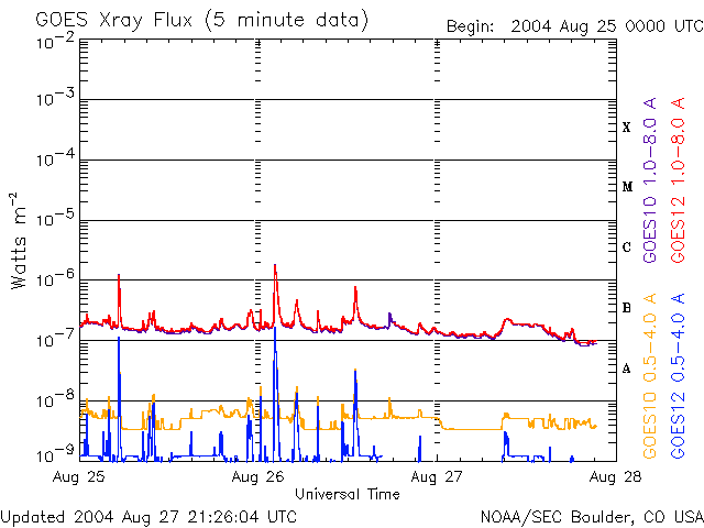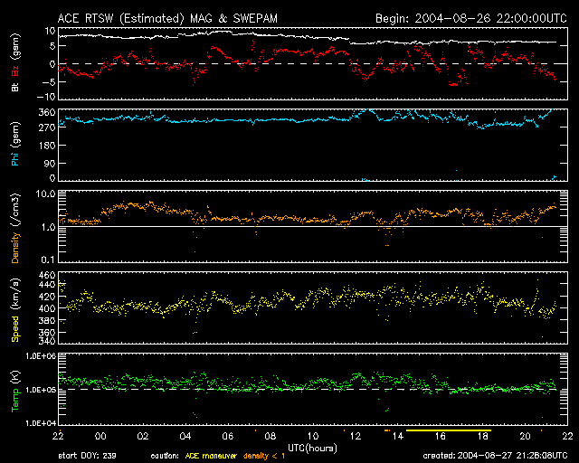 2004/ 8/28 06:29 更新 太陽風は速度400km/秒。磁気圏は静かです。太陽のフレア活動も見られません。 担当 篠原 ACE衛星の観測によると、太陽風の速度は400km/秒で静穏状態が続いています。 昨日から磁場の強度がやや強まっていたのですが、大きく南を向く事は無く、 磁気圏への影響はほとんどありませんでした。 オーロラ活動を示すAE指数はほとんど変化が無く、磁気圏は概ね穏やかです。 LASCO C3カメラでは、太陽の西縁でCME(太陽ガスの放出現象)が観測されています。 ほぼ真横を向いていますので、地球への影響はないでしょう。 SOHO EIT284の太陽画像にもコロナホールは見られず、 太陽風、磁気圏ともに穏やかな日が1週間程度続きそうです。 太陽黒点は規模が縮小しているのか、一層小さく見えています。 フレア(太陽爆発)活動も見られず、穏やかです。 SOHO衛星のEIT284カメラの映像 (c) SOHO (ESA & NASA)