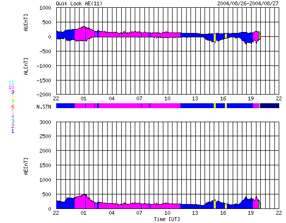 ACEが観測した太陽風の磁場(1番上の枠、白線は全体の強度、赤線は南北成分) および、太陽風の密度(3番目の橙線)、速度(4番目の黄線) (c) NOAA/SEC ![]() リアルタイムAE指数 下段のAEグラフの値が高くなると、オーロラ活動が活発化しています。 (c) 京都大学, NICT ![]() SOHO衛星のMDIカメラによる太陽黒点 (c) SOHO (ESA & NASA) ![]() GOES衛星の太陽X線データ (c) NOAA/SEC ![]() | |||||||||||||||||||||||||||||||||||||||||||||